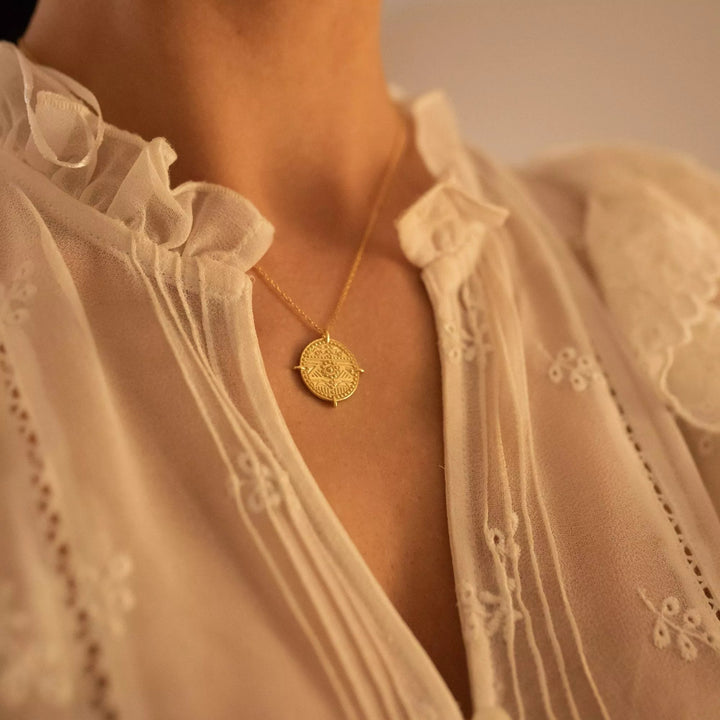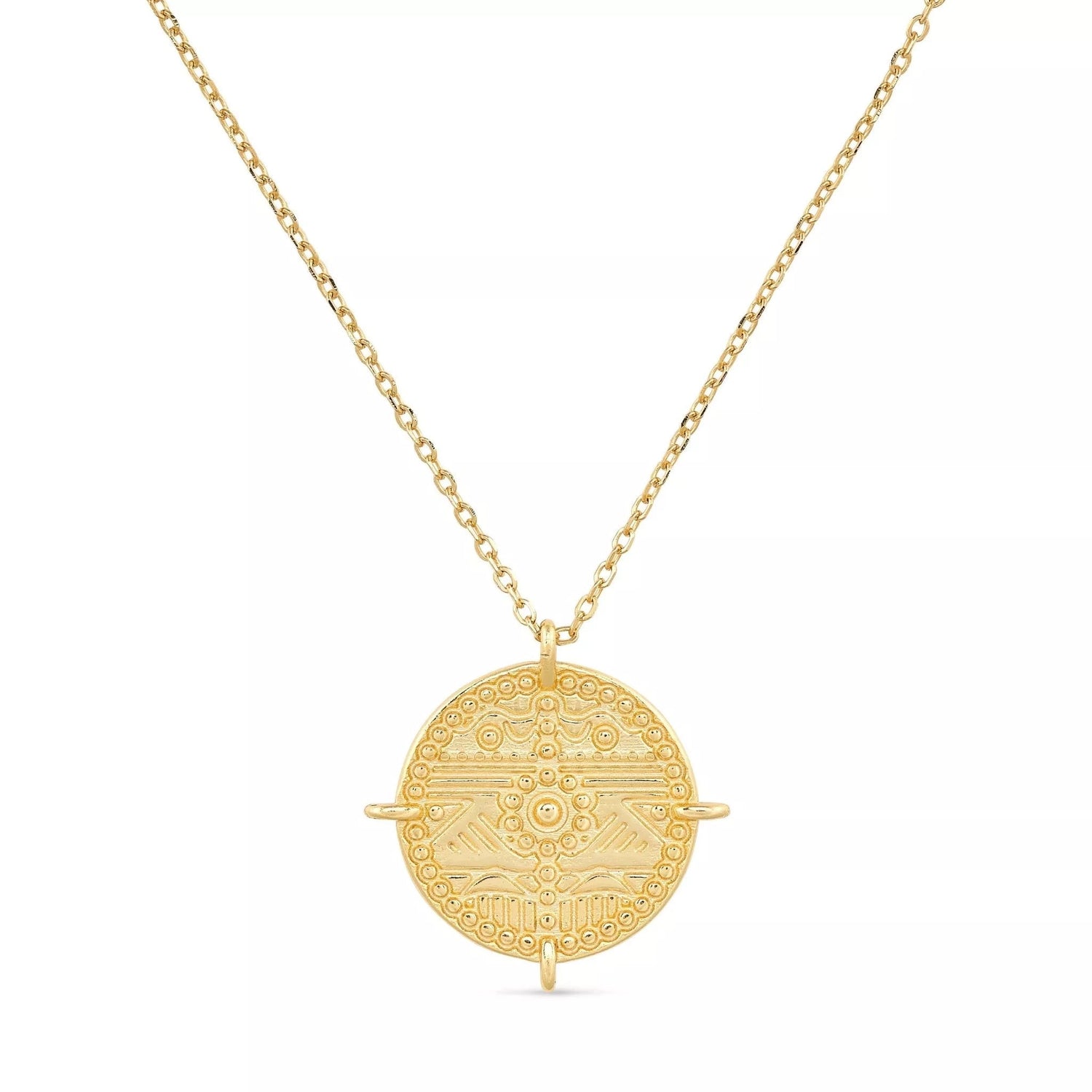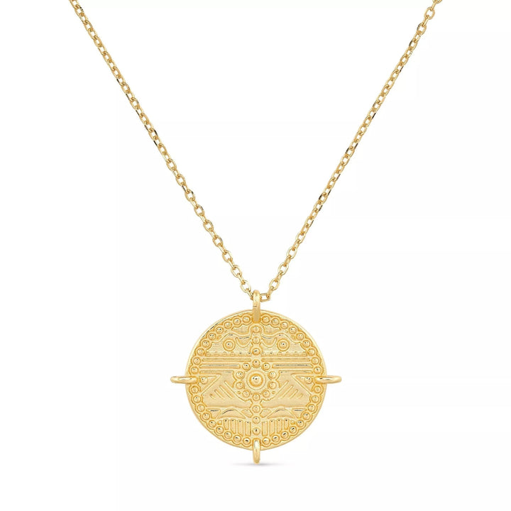 The Chunky Gold Aztec Coin Medallion Necklace by Elk & Bloom is a perfect accessory for anyone who wants a little sparkle. The necklace is made entirely of solid sterling silver and is coated in genuine 14k gold plating. It features a small coin Aztec circle design with a pendant size of approximately 22mm. The chain is 44cm long with an extender. This chunky necklace is a beautiful statement piece.