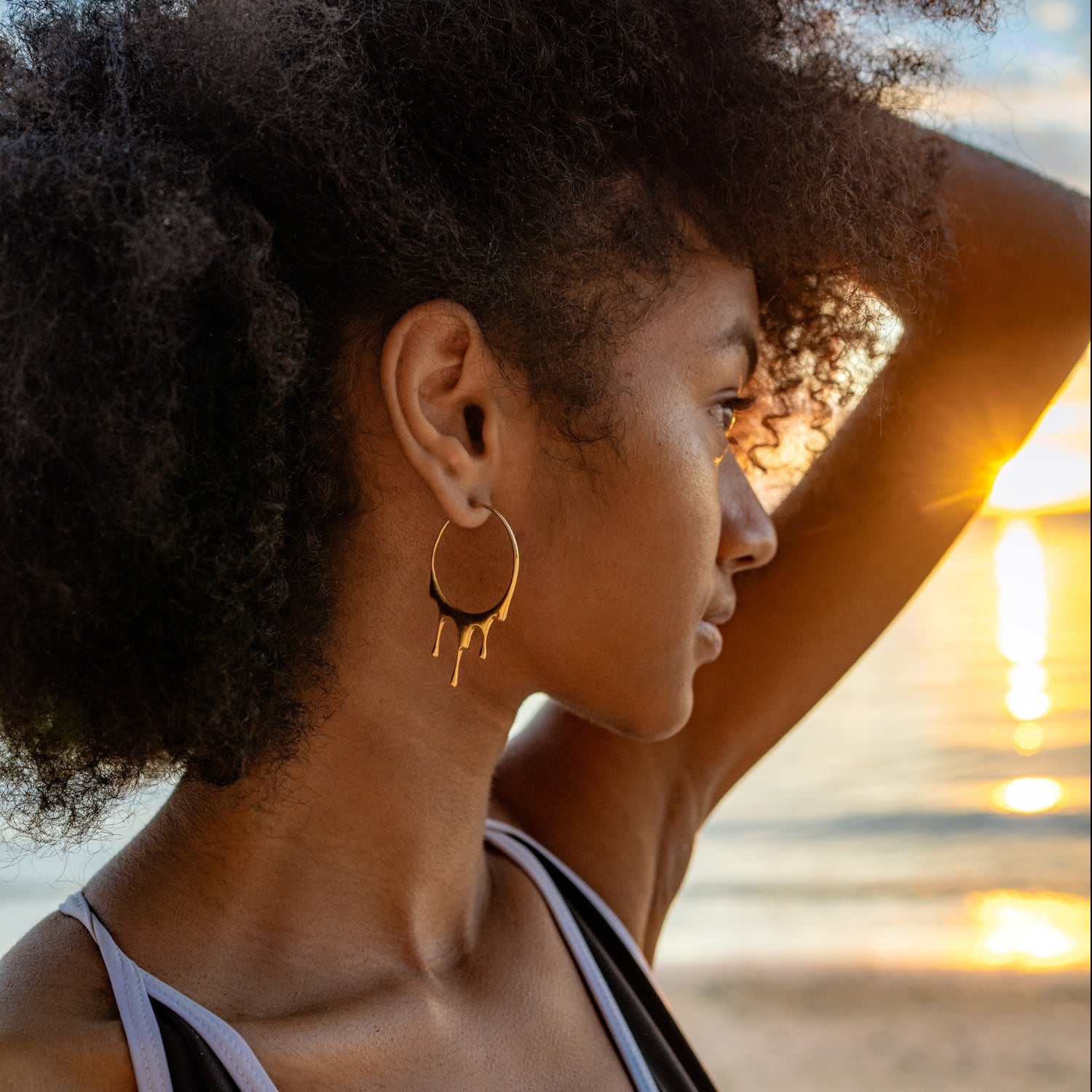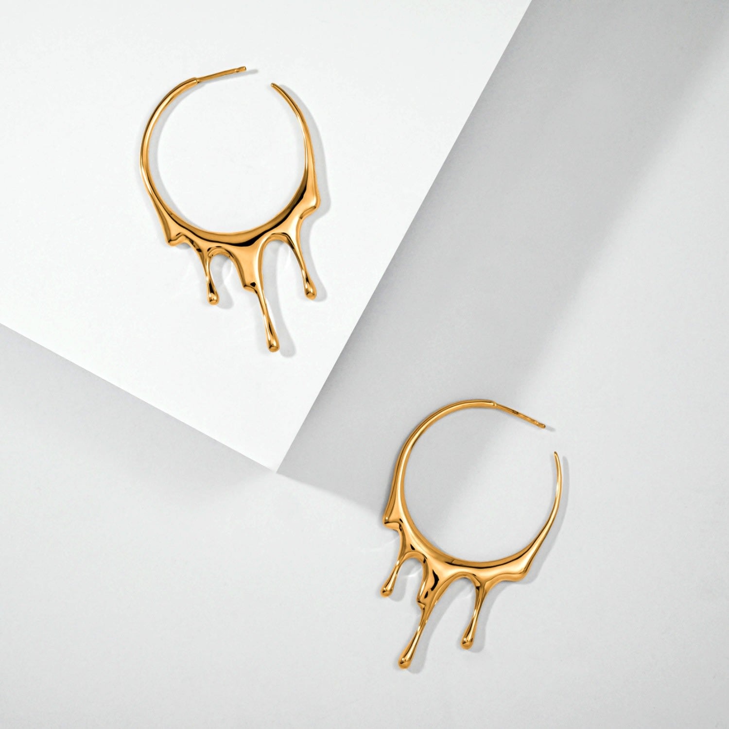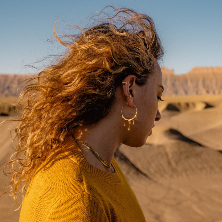 These Dripping Circular M-2 Gold Vermeil Hoop Earrings by Marie June Jewelry bring sculptural elegance to a classic silhouette. Inspired by the fluidity of molten metal, the design curves into bold circular forms that glow with radiant warmth. Hand-polished to perfection, the thick 24k gold vermeil surface enhances their timeless allure, while their comfortable fit and dual earring backs make them both stylish and practical. A modern take on the hoop earring, these pieces embody strength, grace, and everyday luxury.