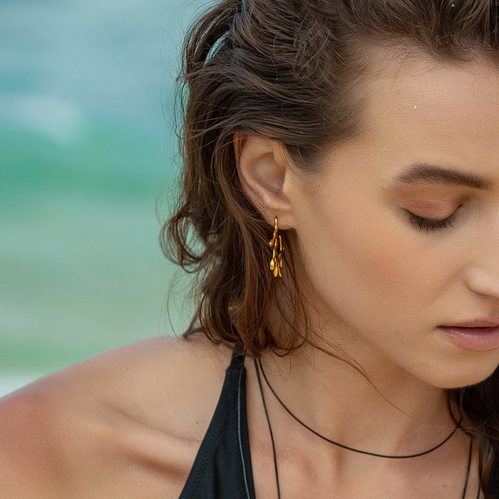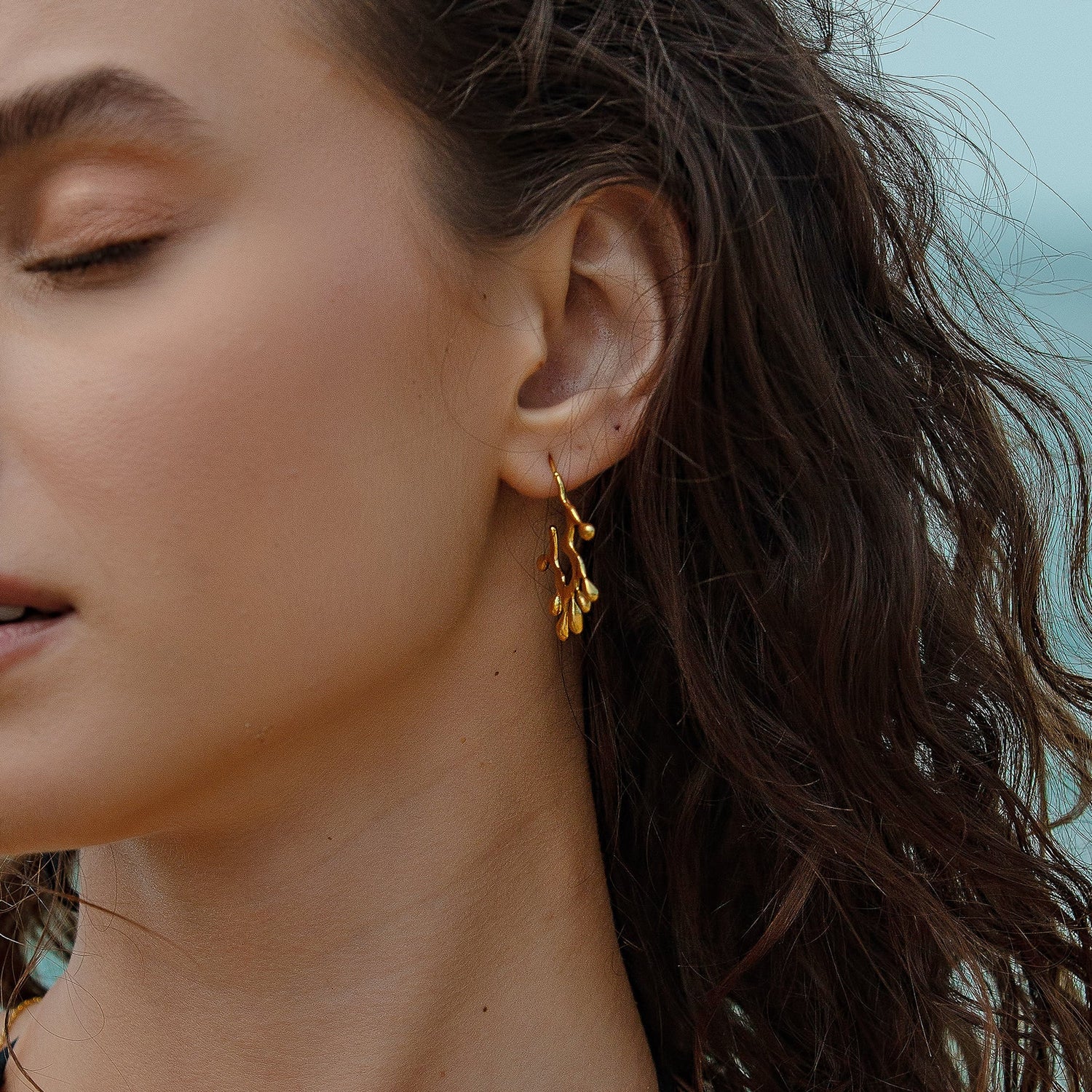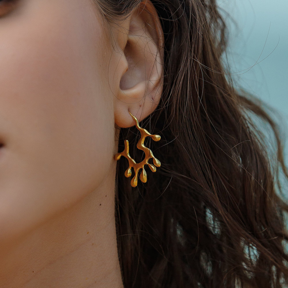 These earrings are handcrafted from silver with a gold finish. They have a unique melting and dripping irregular hoop design.