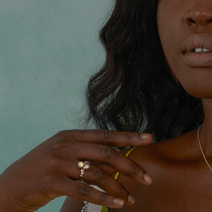 The Cosmo 18K Gold-Plated Multicolor Ring by Vintouch Italy is a joyful celebration of color. From the brand’s Cosmo collection, it features bezel-set moonstone, amethyst, and citrine quartz in a vibrant arrangement designed to uplift the spirit. Handmade in Italy, it combines artisanal craftsmanship with playful sophistication for a truly mood-boosting piece.