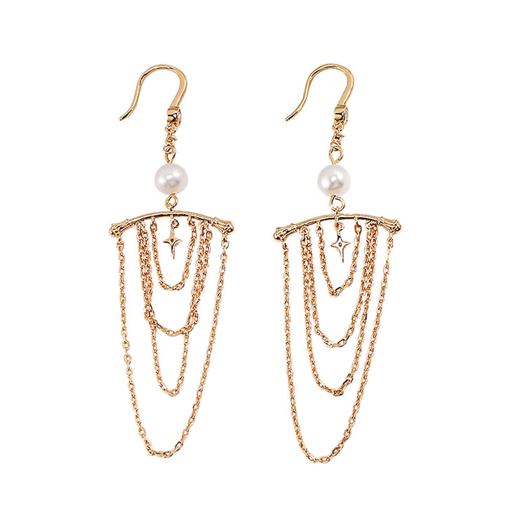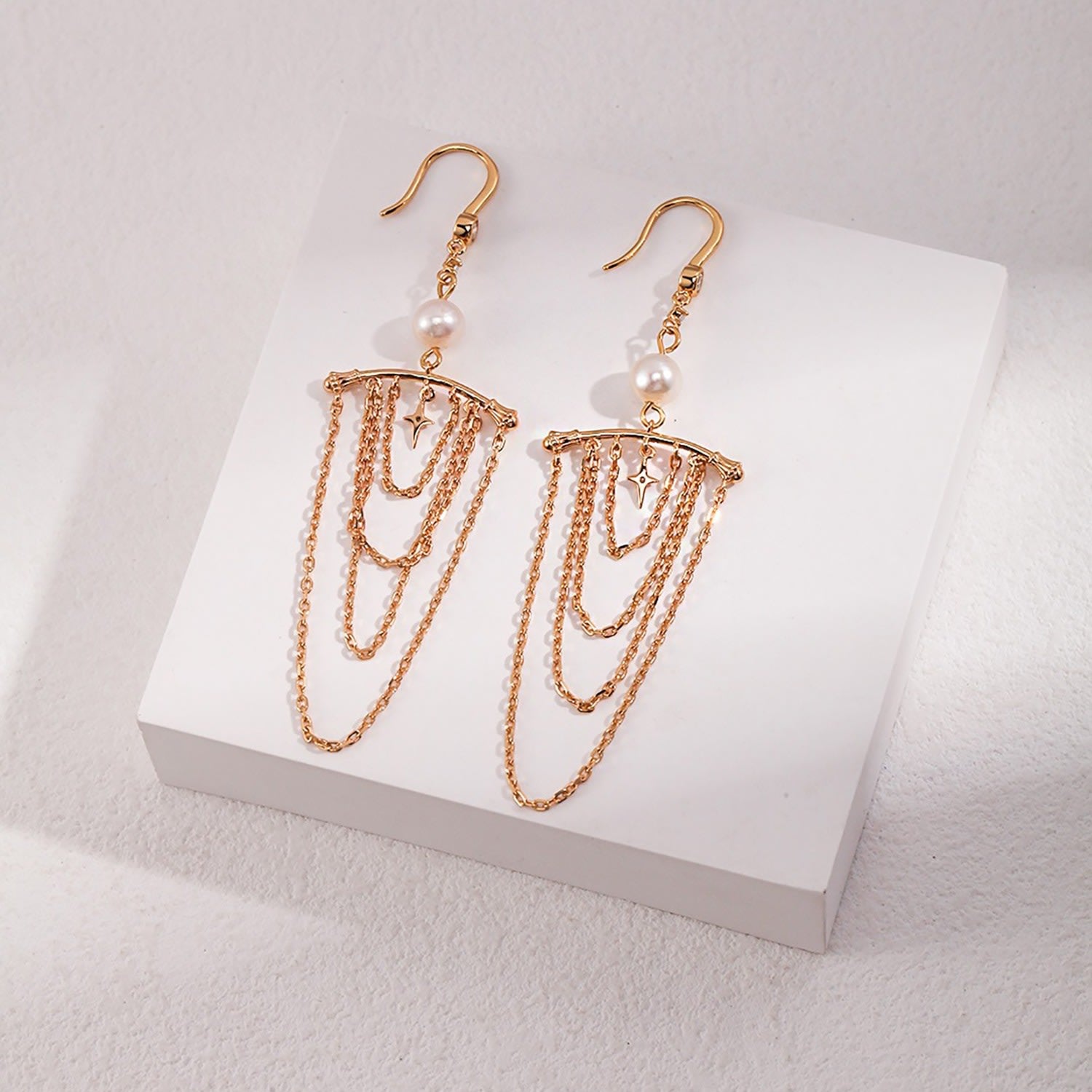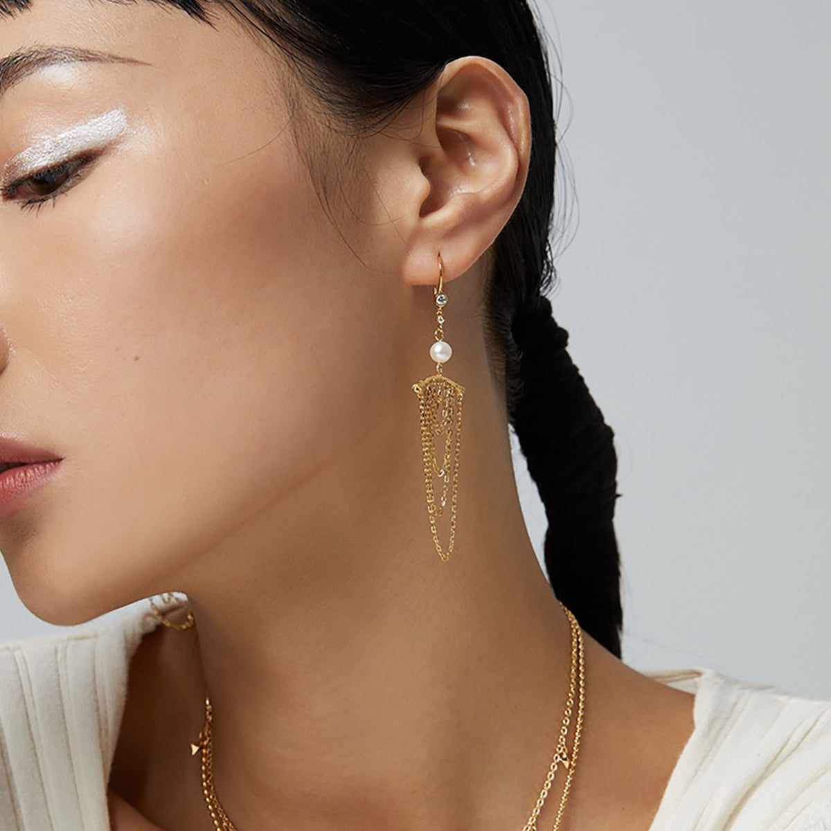 These earrings are made from gold plated sterling silver and feature a chandelier design with intricate details. They have secure clasps for comfort and stability.