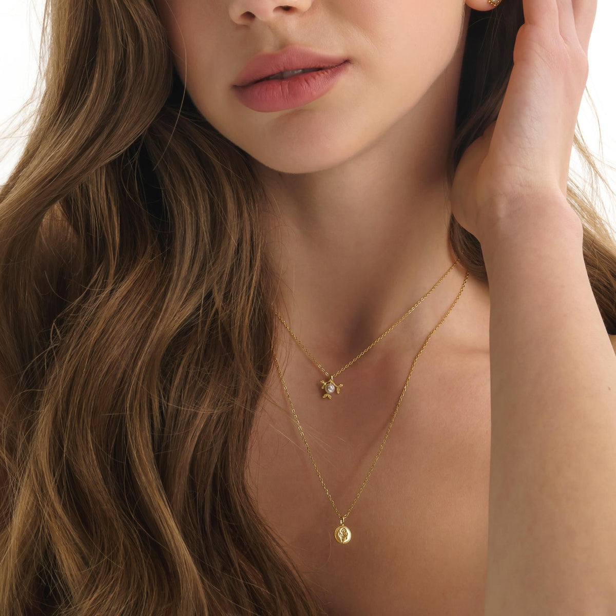 This necklace is made of solid sterling silver with genuine 14k gold plating. It features a flower-engraved coin pendant that is approximately 8mm. The chain is 44cm long with an extender.