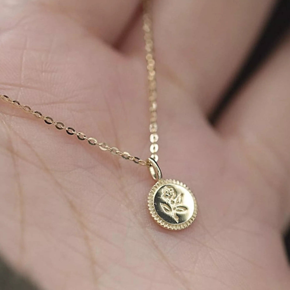 This Dainty Gold Rose Flower Necklace by Elk & Bloom is a perfect accessory for a little sparkle. The necklace is made entirely of solid sterling silver and is coated in genuine 14k gold plating. It features a small coin design with an engraved image of a flower. The pendant is approximately 8mm, and the chain is 44cm with an extender. This beautiful and dainty necklace is perfect for gifting.