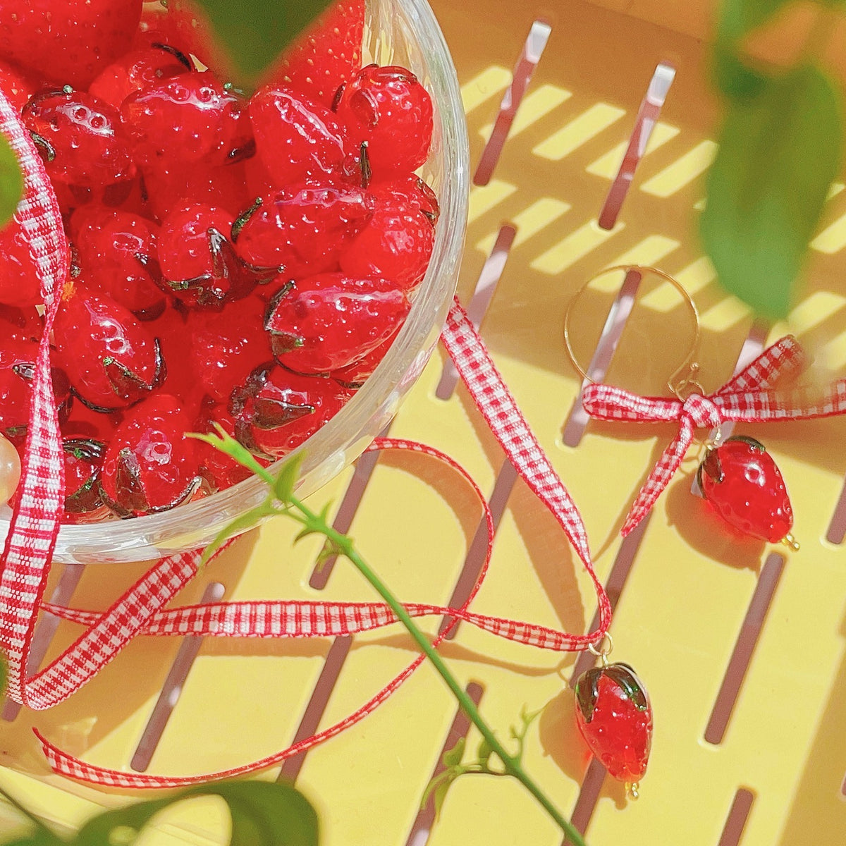 This choker is a handmade item with a lampwork glass strawberry pendant on a gingham ribbon.
