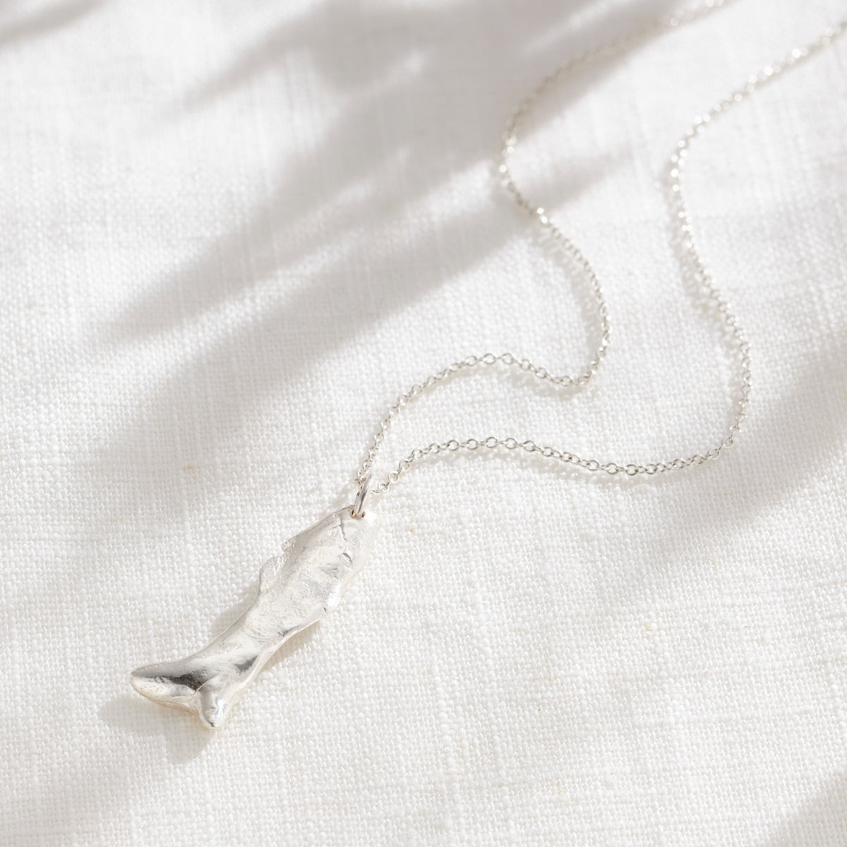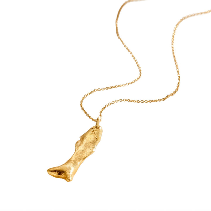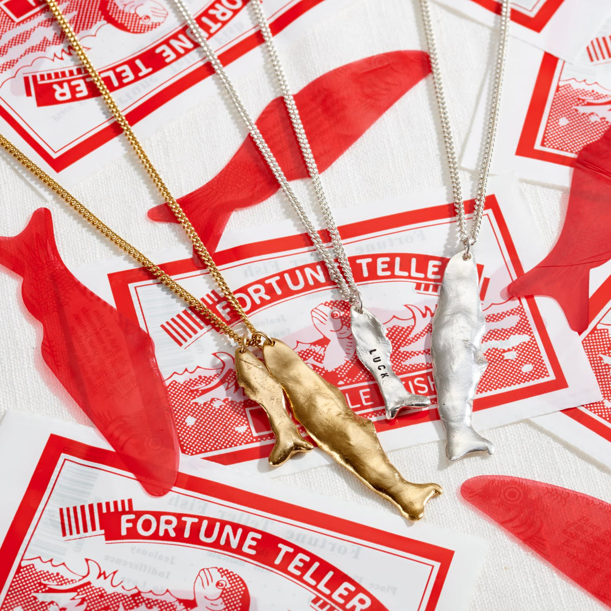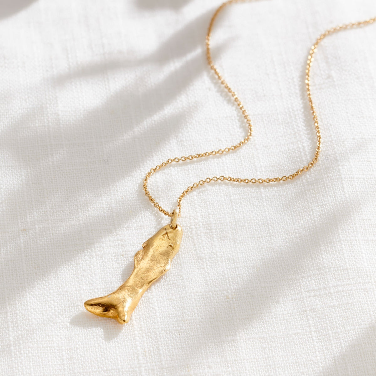 Materials: This necklace is made from recycled sterling silver and is plated in 18ct gold. The fortune fish-inspired pendant has an organic, fluid shape. It is handcrafted in a Brighton workshop.