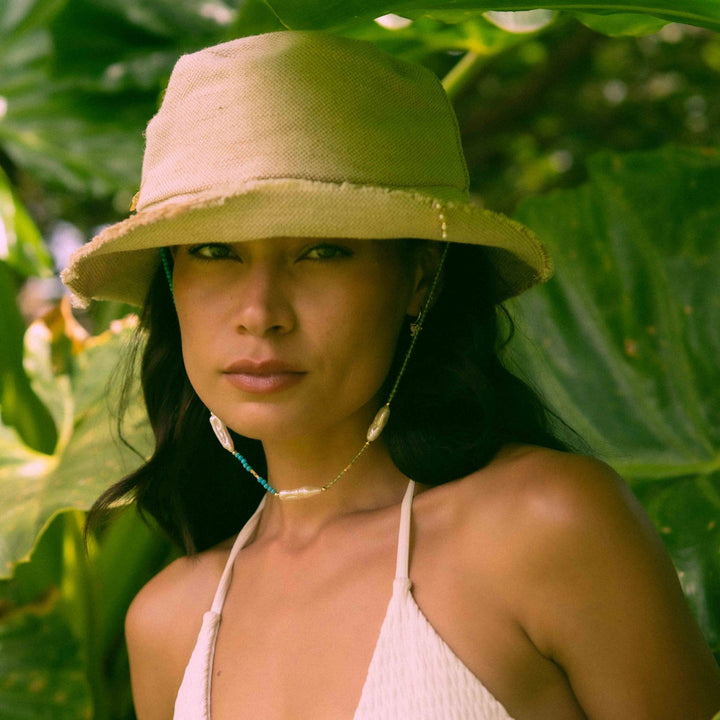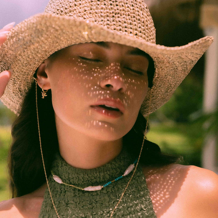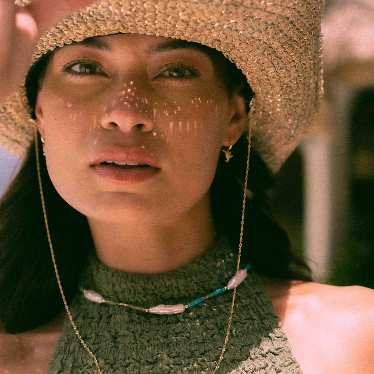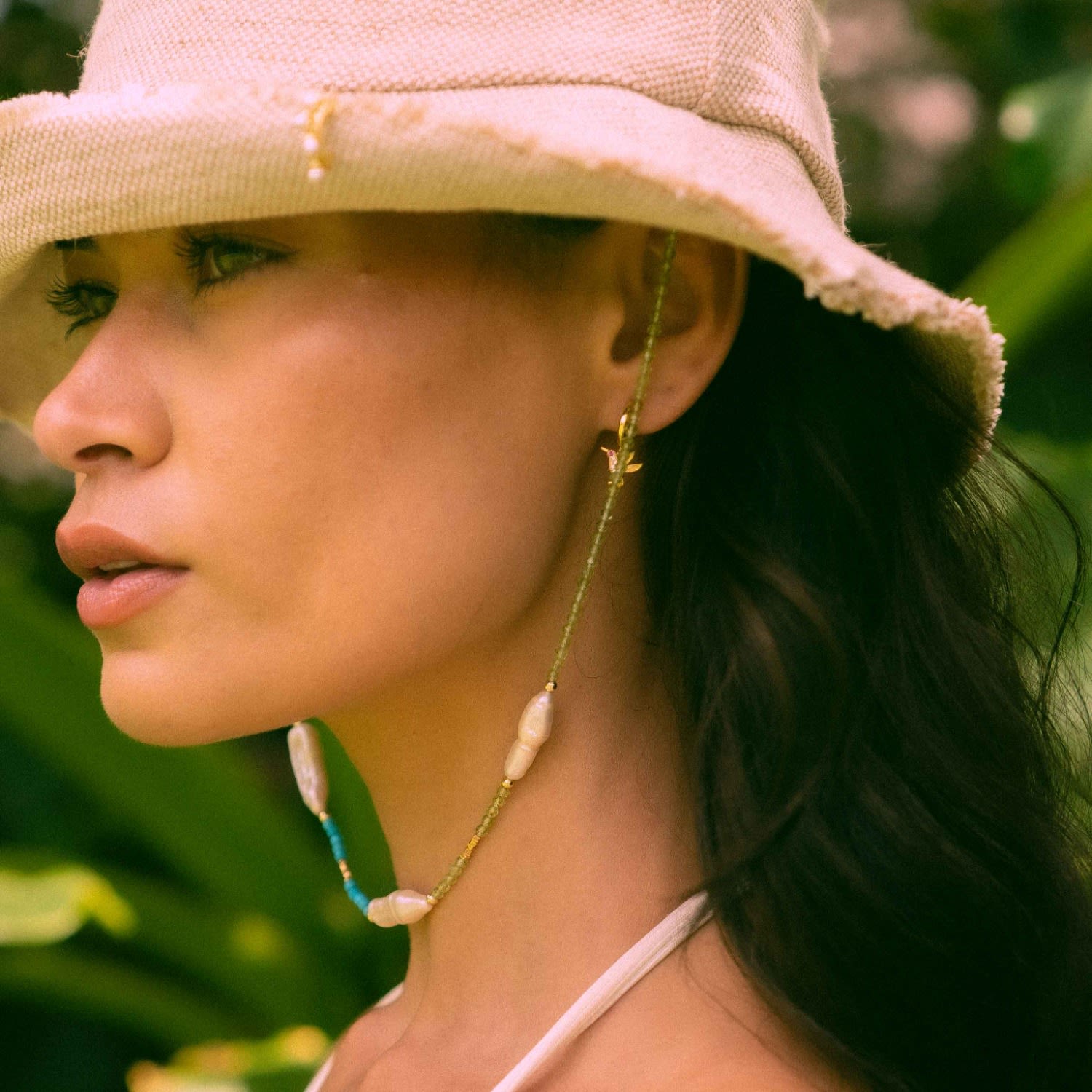 This Azurae Peridot, Pearl & Turquoise Beaded Necklace by Shaded the Label is a limited-edition accessory (only 8 made) inspired by open skies, clear waters, and serene fields of green. It is crafted entirely of Natural Peridot, Turquoise, Freshwater Baroque Pearls, and 18k Gold Plated Sterling Silver. This necklace can be worn on the neckline or attached to headwear.