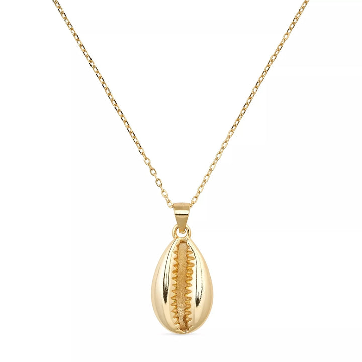 This necklace is made from solid sterling silver with genuine 14k gold plating. It features a cowrie shell charm and has a chain length of 44cm with an extender.