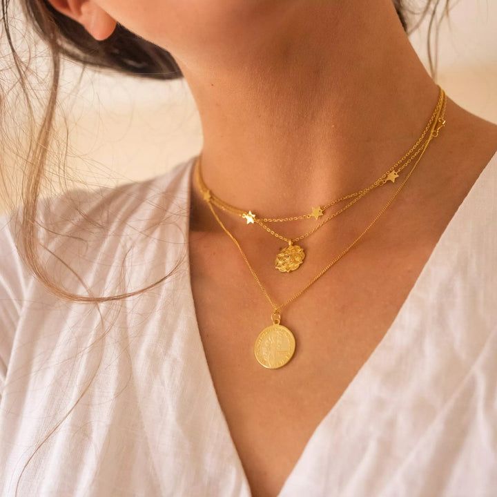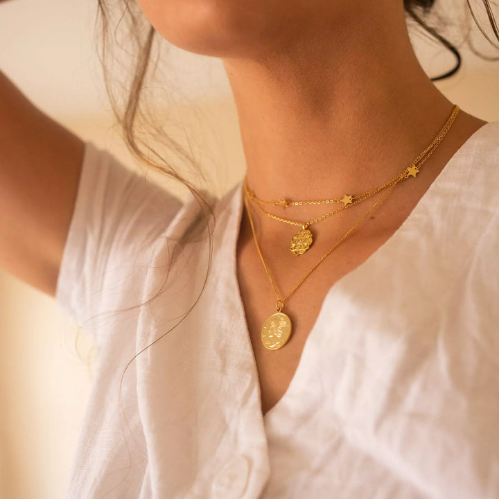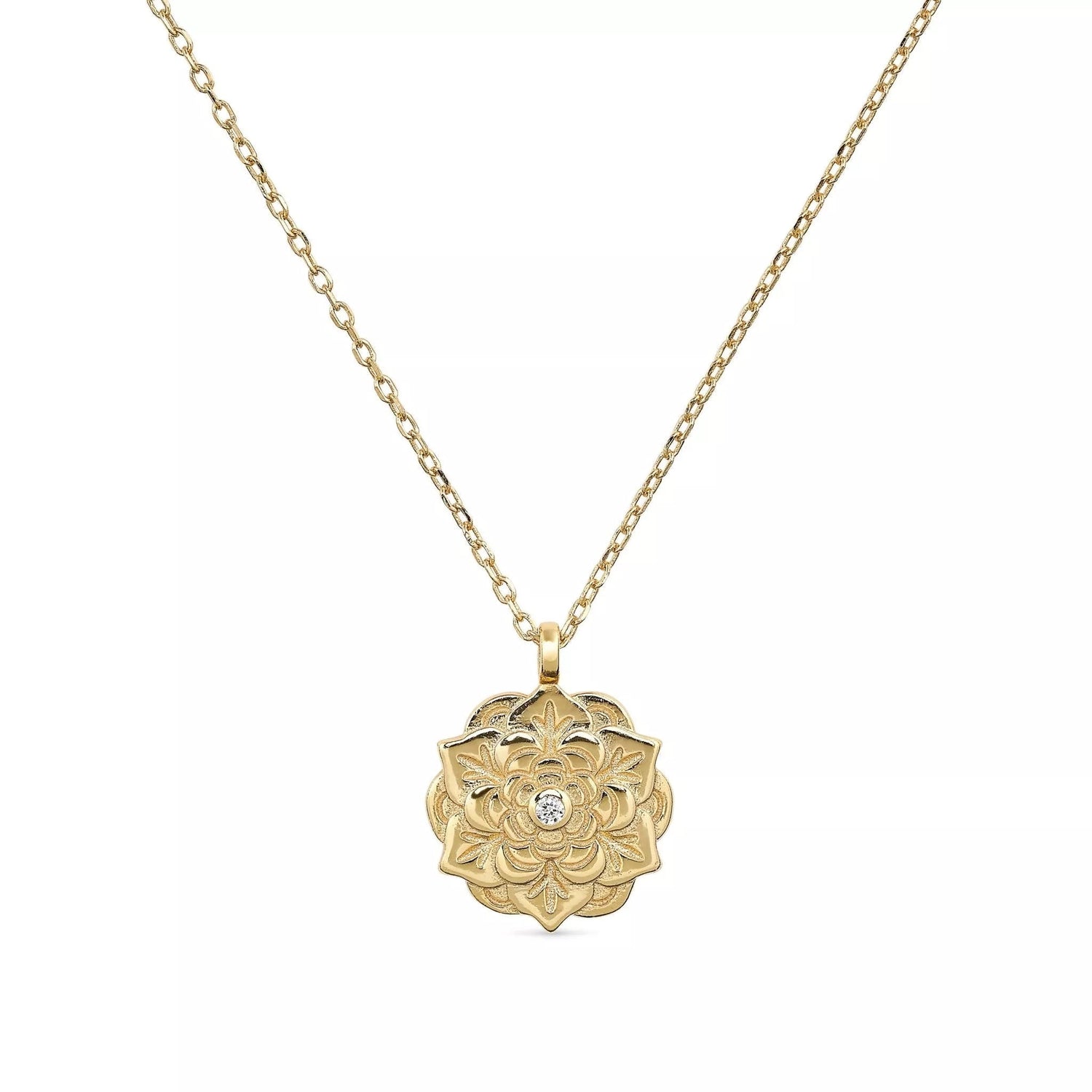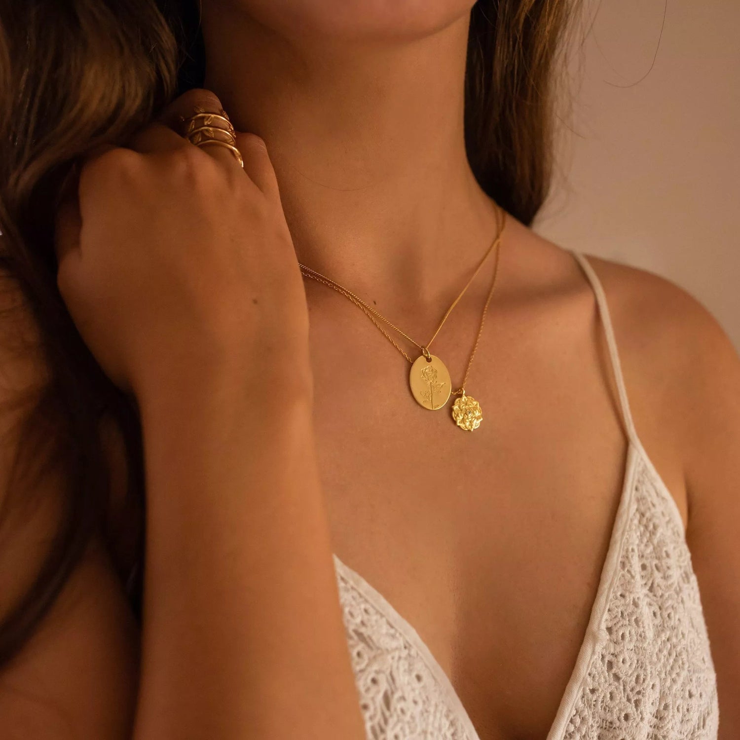 This Dainty Gold Lotus Flower Necklace by Elk & Bloom is a delicate and layered piece that brings a subtle sparkle to your style. The necklace is designed with a small coin lotus pendant, a symbol of purity, enlightenment, and rebirth. A central cubic zirconia stone adds a touch of light and brilliance. Its classic design and elegant charm make it perfect for layering with other pieces or wearing on its own as a simple, meaningful statement.