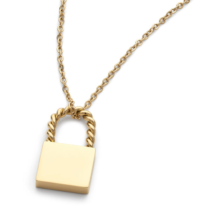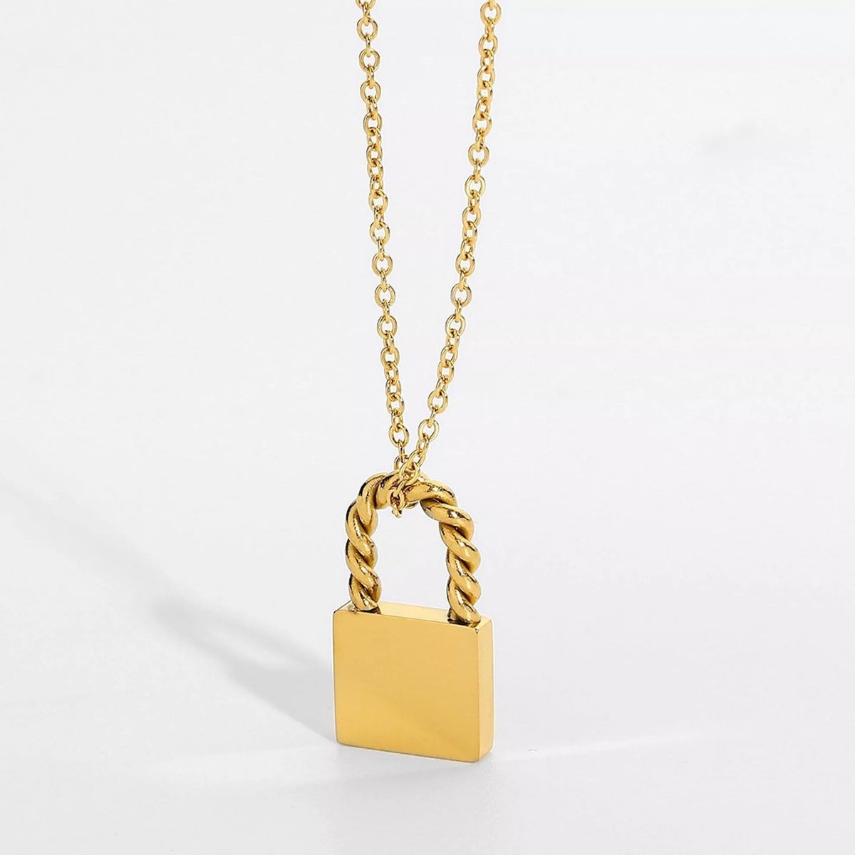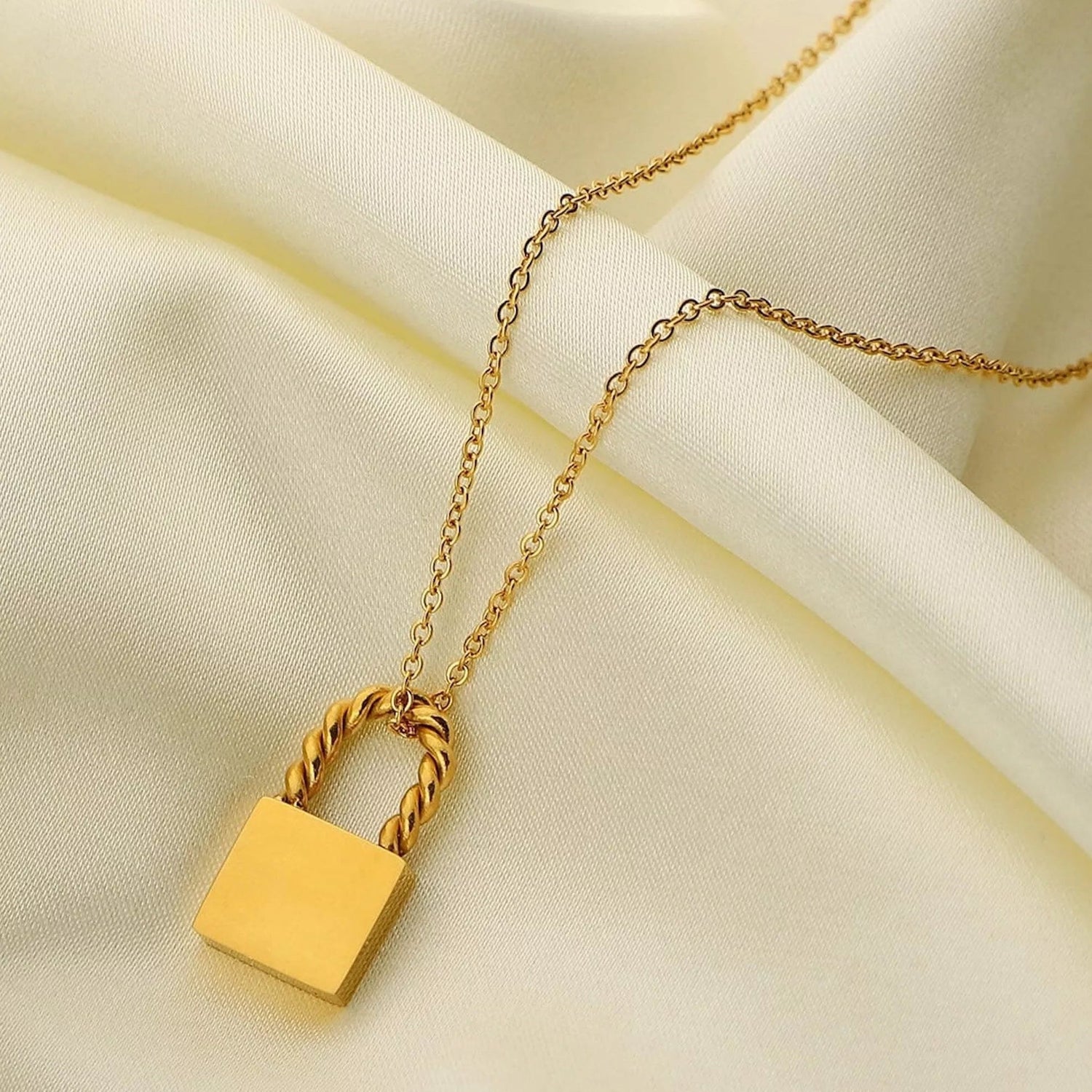 This Dainty Gold Lock Necklace by Elk & Bloom brings playful symbolism to your style. Featuring a petite lock-and-key pendant, it embodies ideas of love, security, and cherished secrets. Lightweight and versatile, it layers beautifully or shines alone as a subtle yet meaningful statement.