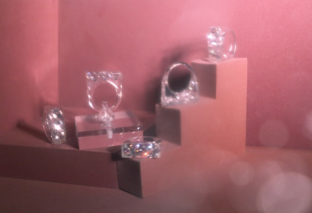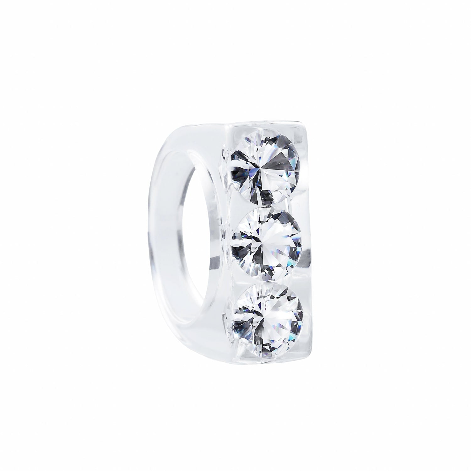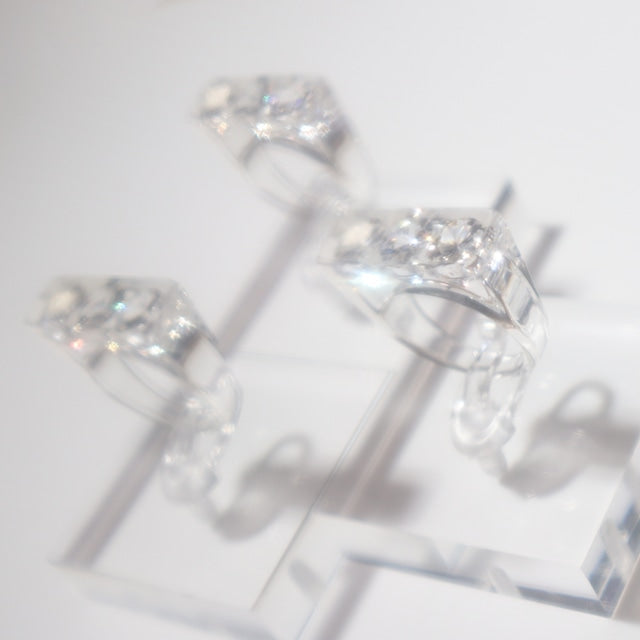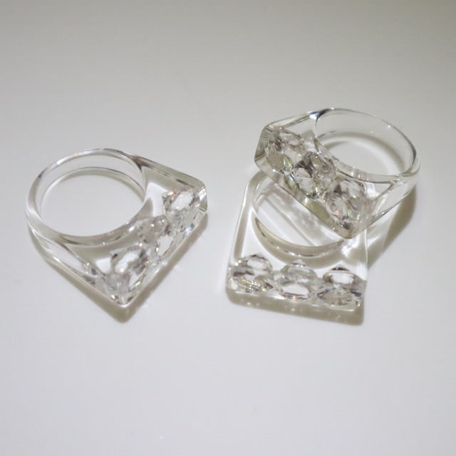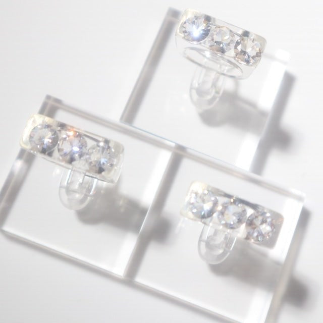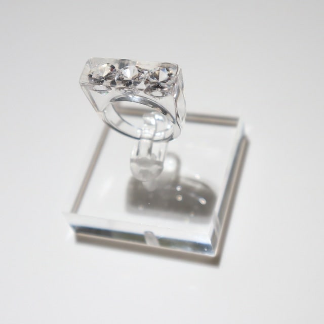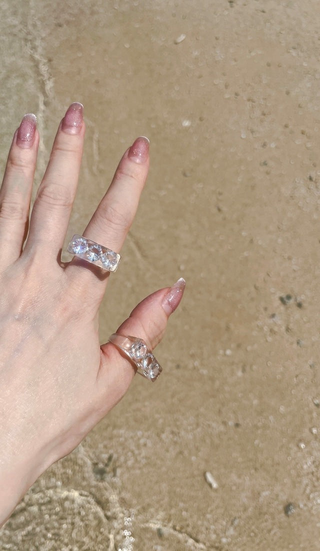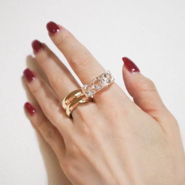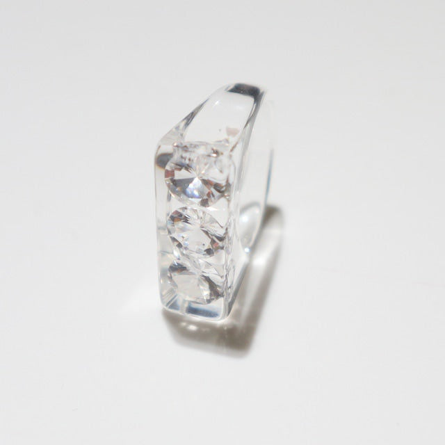 The Sparkle Ring by Iostudio is an artistic and versatile ring featuring three clear zirconia stones. Made in Japan from polyester resin, the stones sparkle in both natural and dim light. This ring can be worn with casual or classical styles and is designed to be paired with other gold or silver rings.