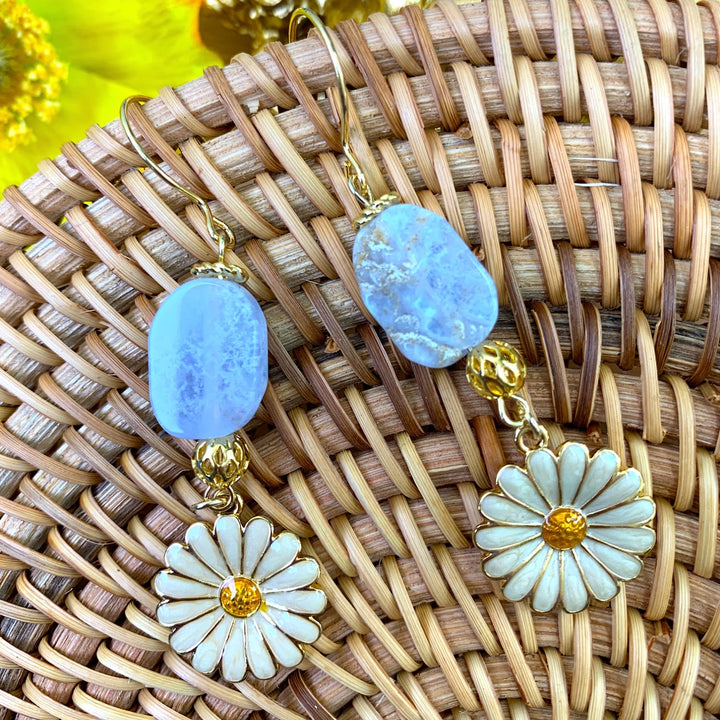 These handmade hook earrings are crafted from blue lace agate with a daisy dangle and Japan golden-plated brass findings.