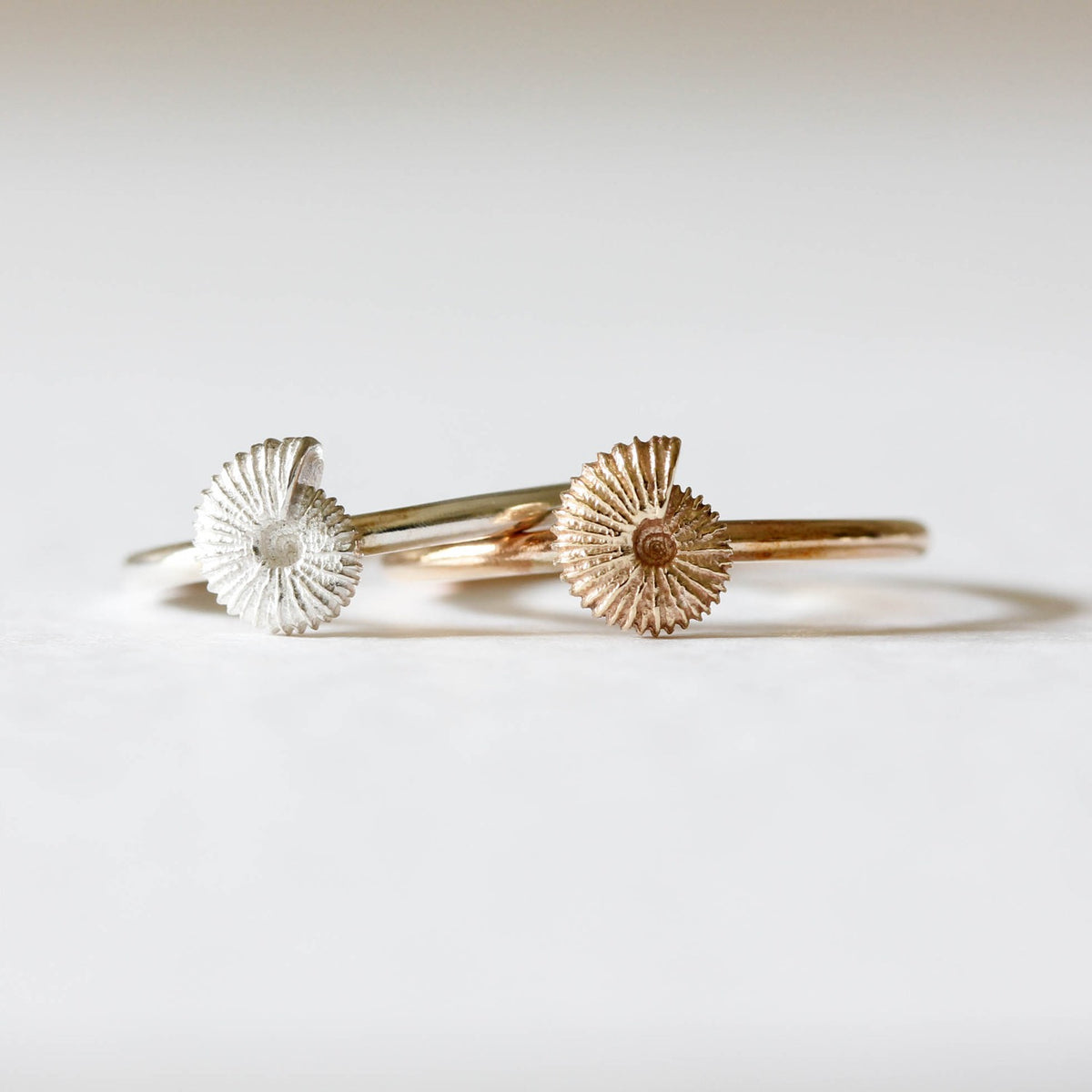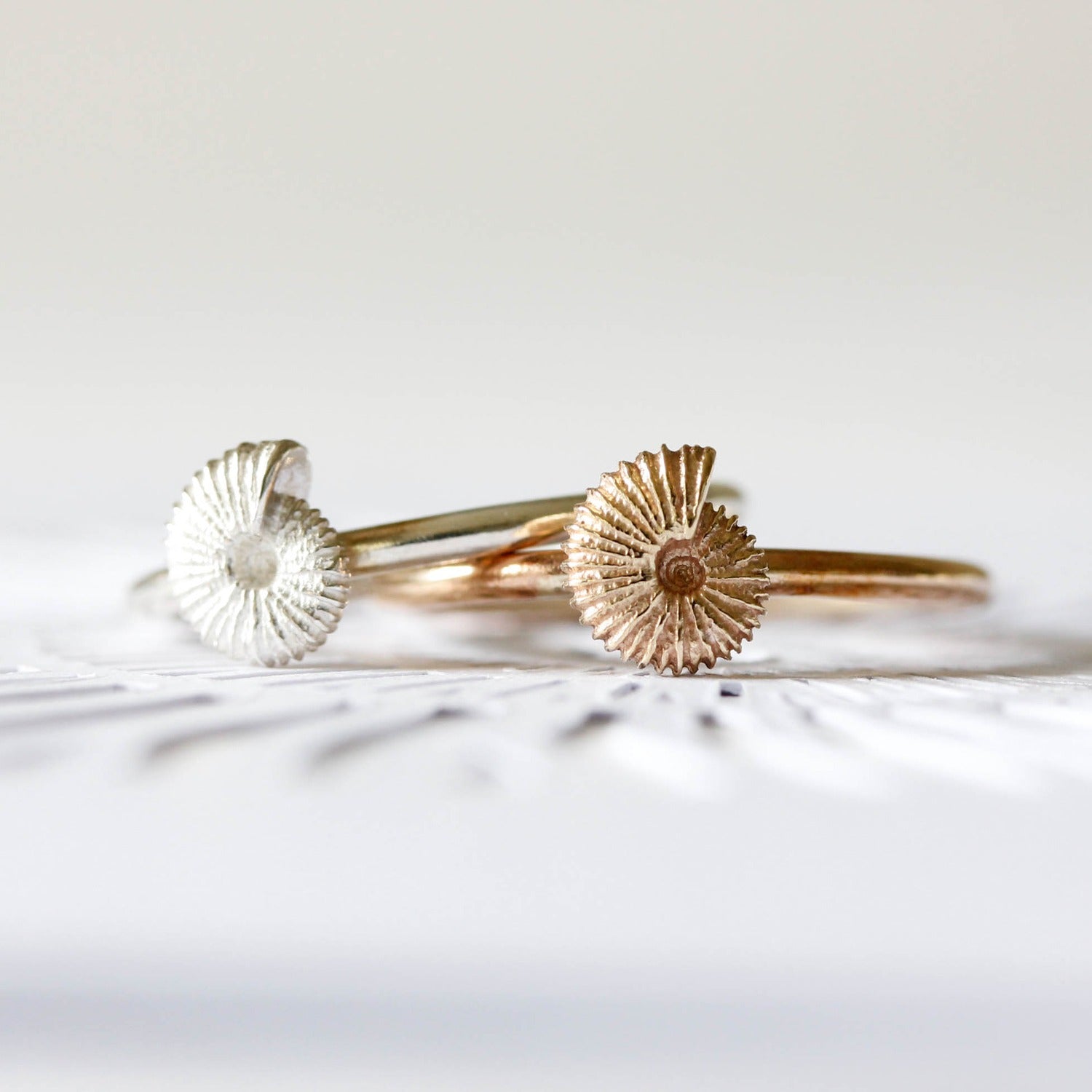This beautifully sculpted ammonite ring has an elegant, feminine shape that draws the eye to the piece with an ever decreasing spiral in the middle. Ring looks great worn on its own or can be stacked with other rings for a more unique look.