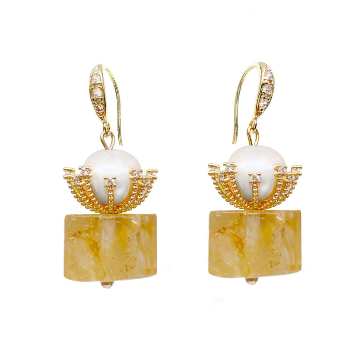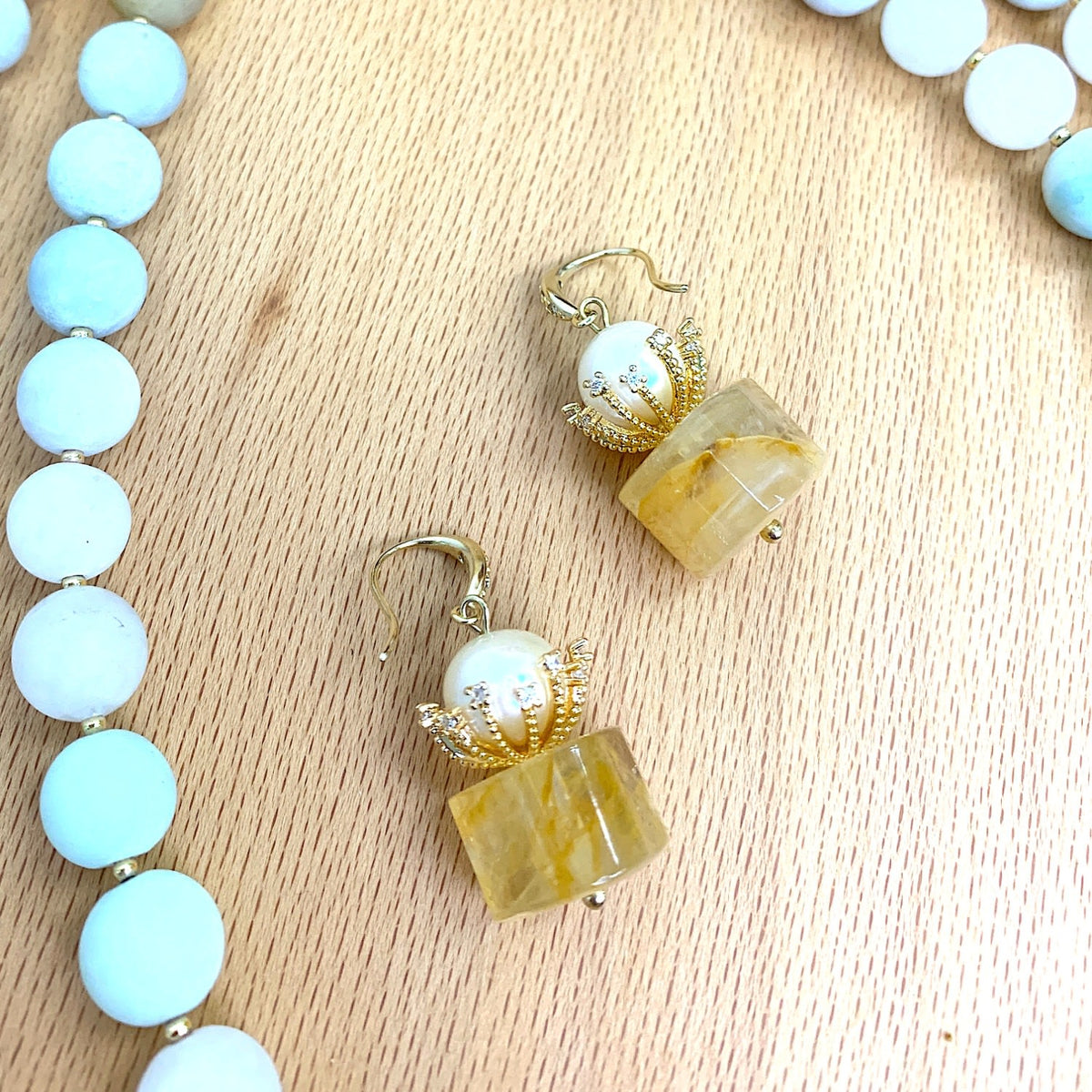 Cylinder Shaped Citrine With Freshwater Pearl Dangle Earrings