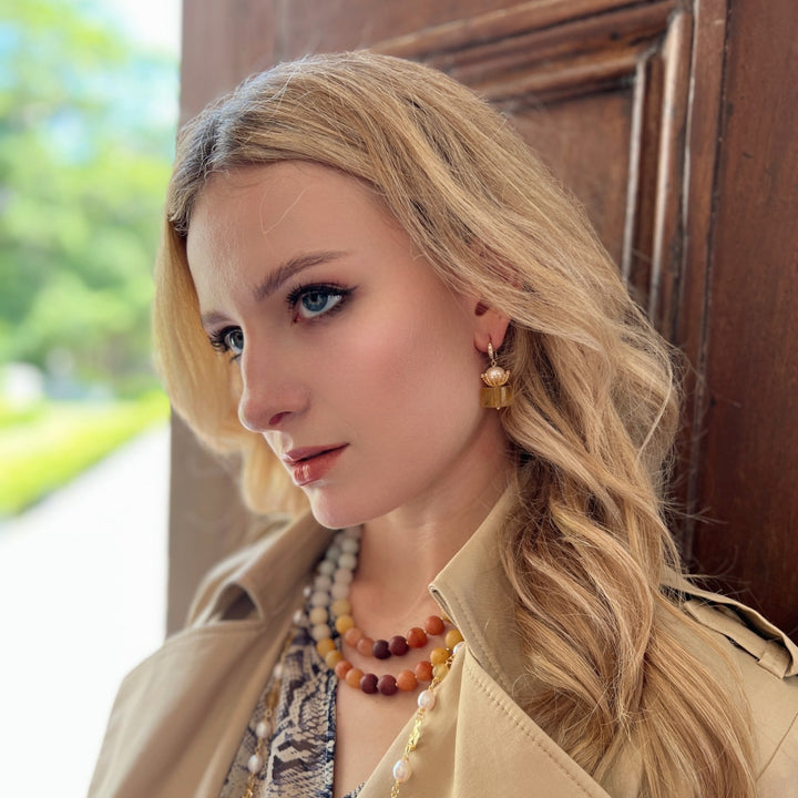 These handmade earrings are crafted from freshwater pearls, citrine, and Japanese gold-plated brass findings.