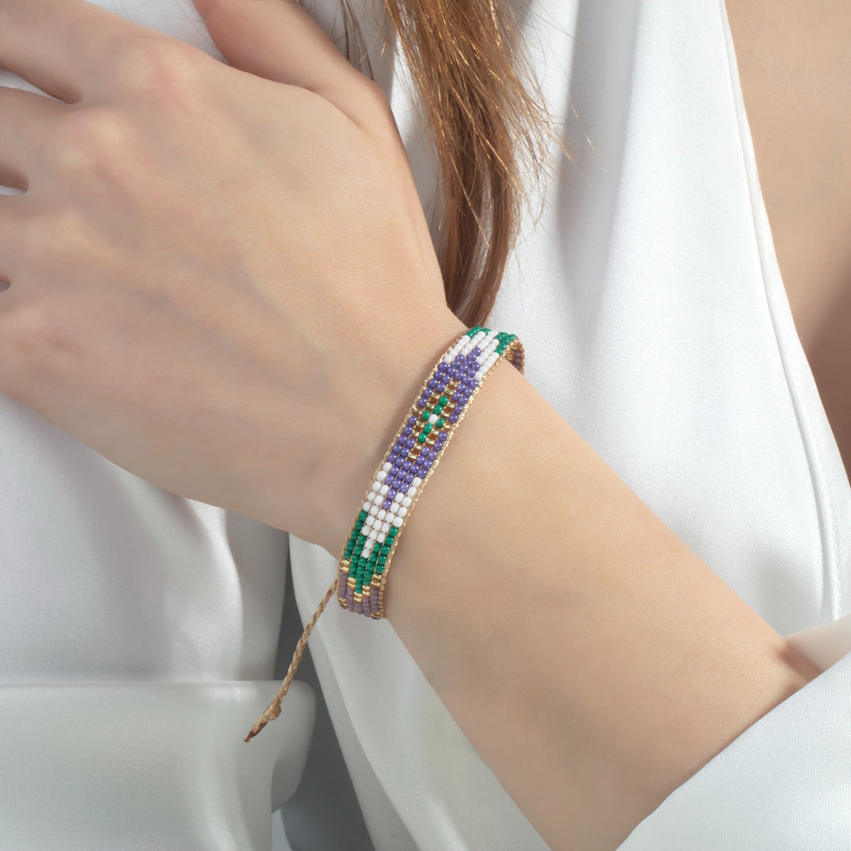 This Ashley Beaded Bracelet - Pink & Purple by Milou Jewelry is a vibrant and comfortable accessory. Handwoven with tiny glass beads, this bracelet features a lively pink and purple color palette. Its light and smooth texture makes it a joy to wear, symbolizing a blend of effortless style and artistic craftsmanship.