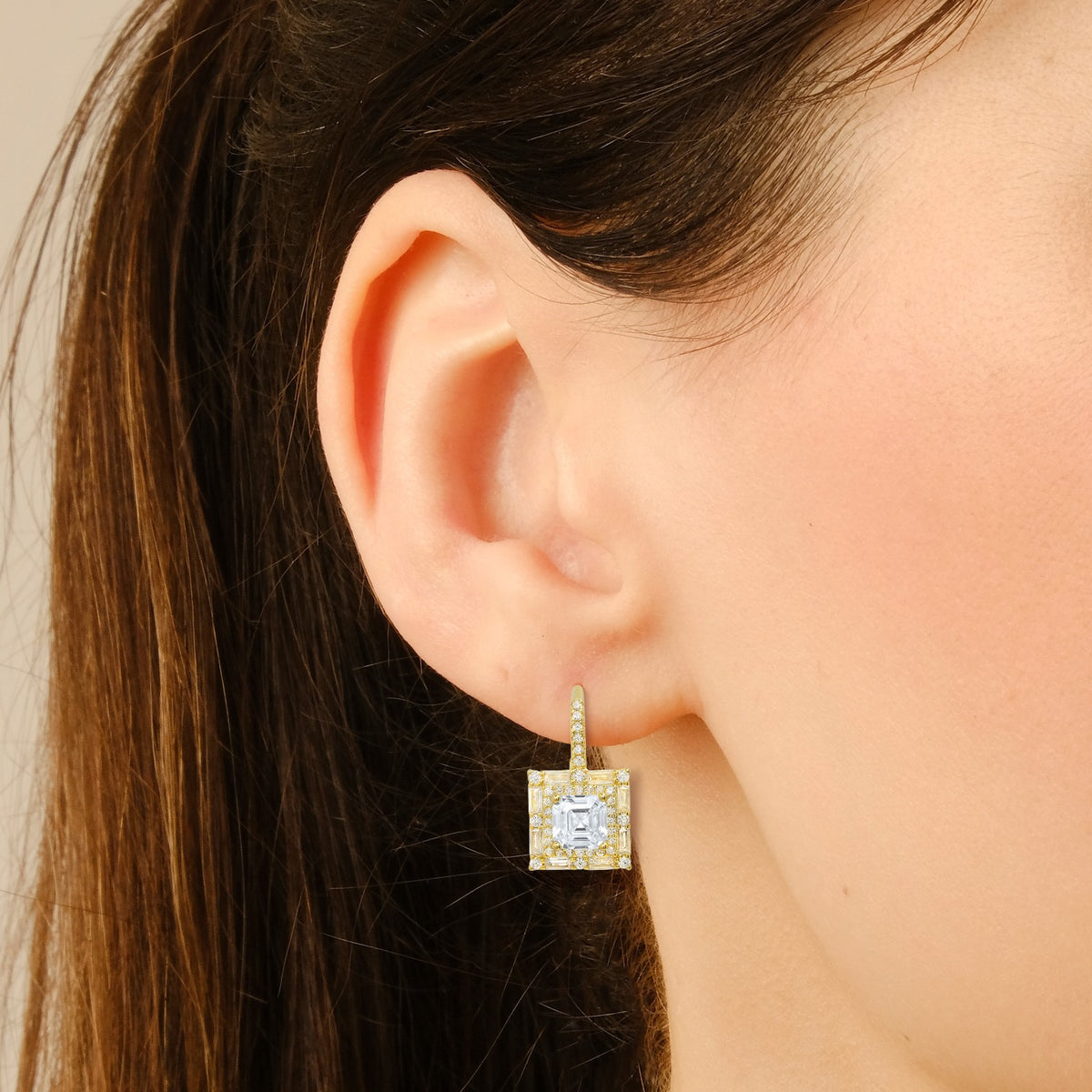 Gold Asscher Cut Halo Cz Leverback Earrings