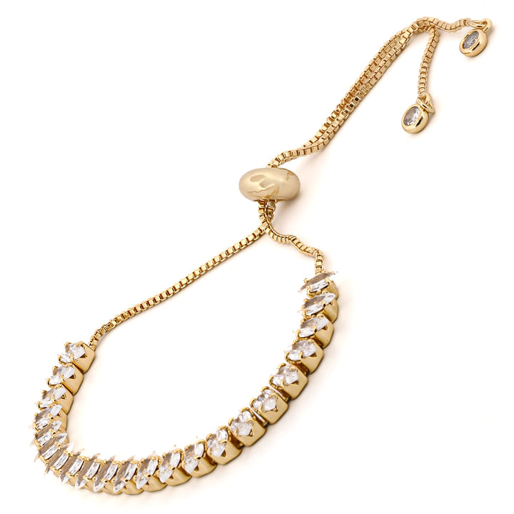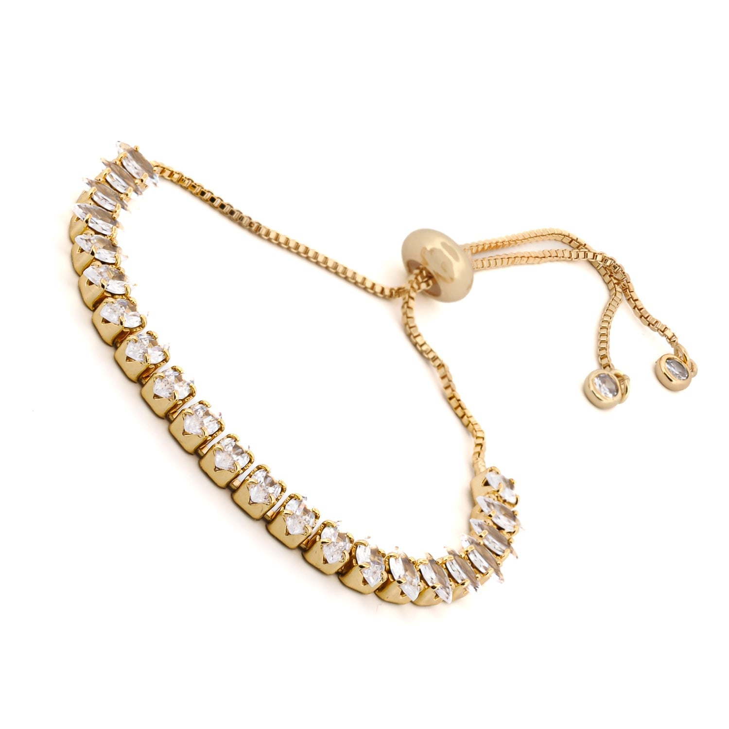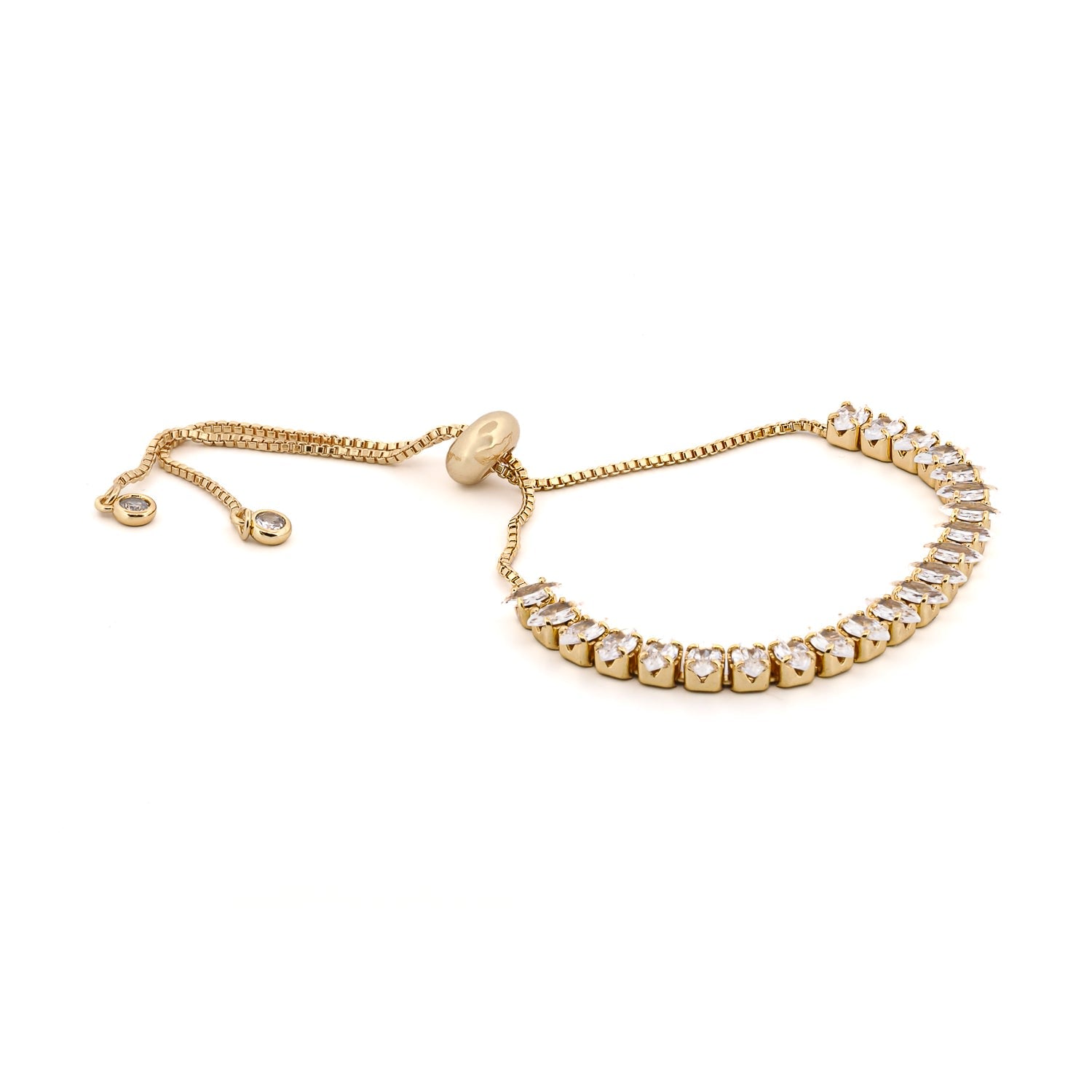 This adjustable bracelet is 18k gold-plated on brass and features CZ diamonds.