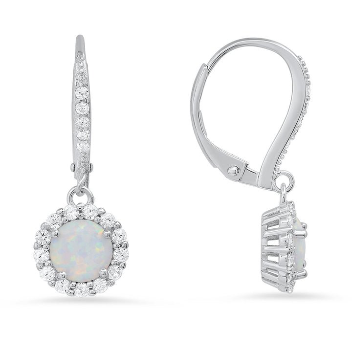 Embrace the ethereal beauty of our Sterling Silver Created Opal and CZ Halo Dangle Lever back Earrings. The exquisite craftsmanship showcases mesmerizing created opals encircled by a brilliant halo of cubic zirconia, creating a harmonious play of colors and light. The lever back design ensures a secure and comfortable fit, while the dangling style adds a touch of grace and movement. These earrings effortlessly blend timeless elegance with contemporary flair, making them a captivating choice for both formal events and everyday glamour. Elevate your jewelry collection with the enchanting allure of these opulent earrings.