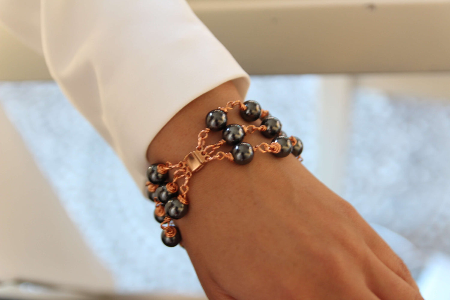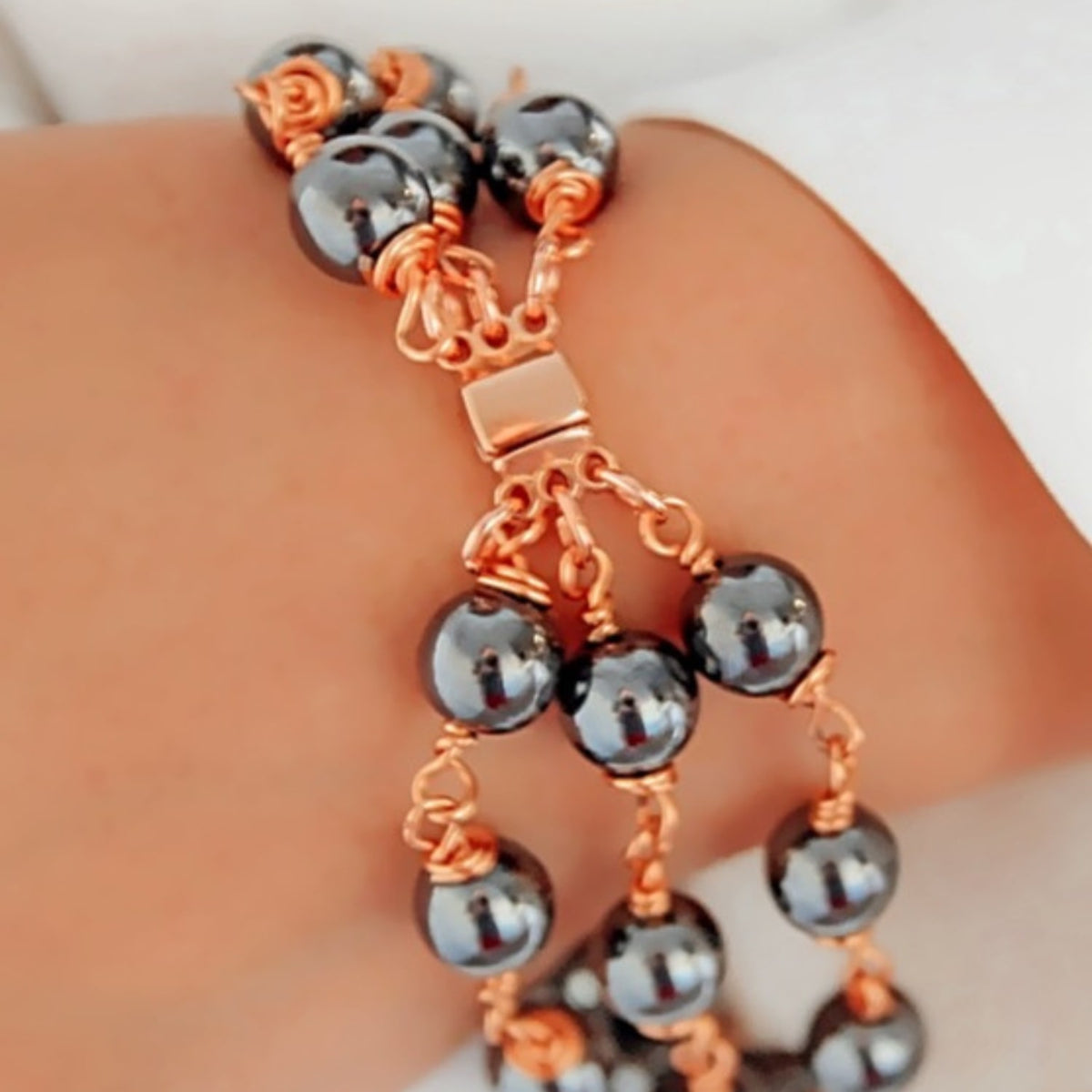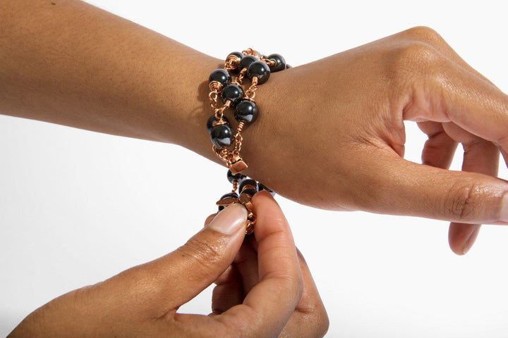 This bracelet is made with black hematite stones and has rose gold accents. It features a magnetic clasp for a secure fit.