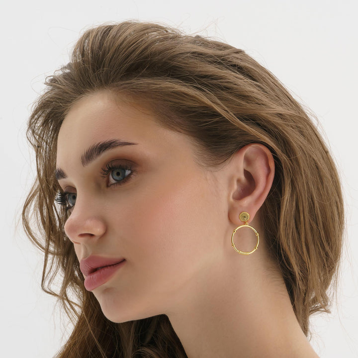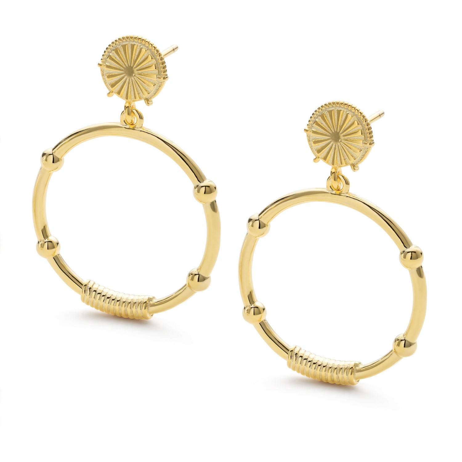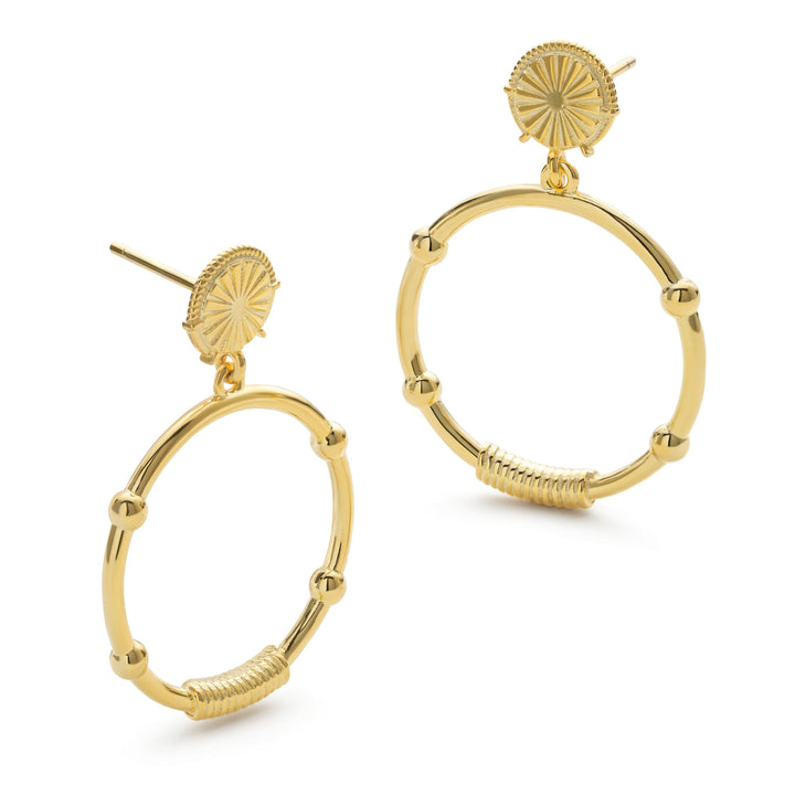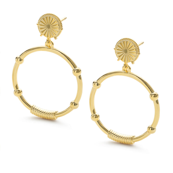 Made with 30 times thicker gold. Effortlessly inspired by the sun - our sunburst halo drop studs elevate every outfit. Get the best of both worlds, with a combined hoop and stud, in one. These earrings are made entirely of sterling silver, and then coated in 14k gold plating. Featuring a sunburst star stud design with a beaded and rope halo circle hoop. Perfect for gifting!