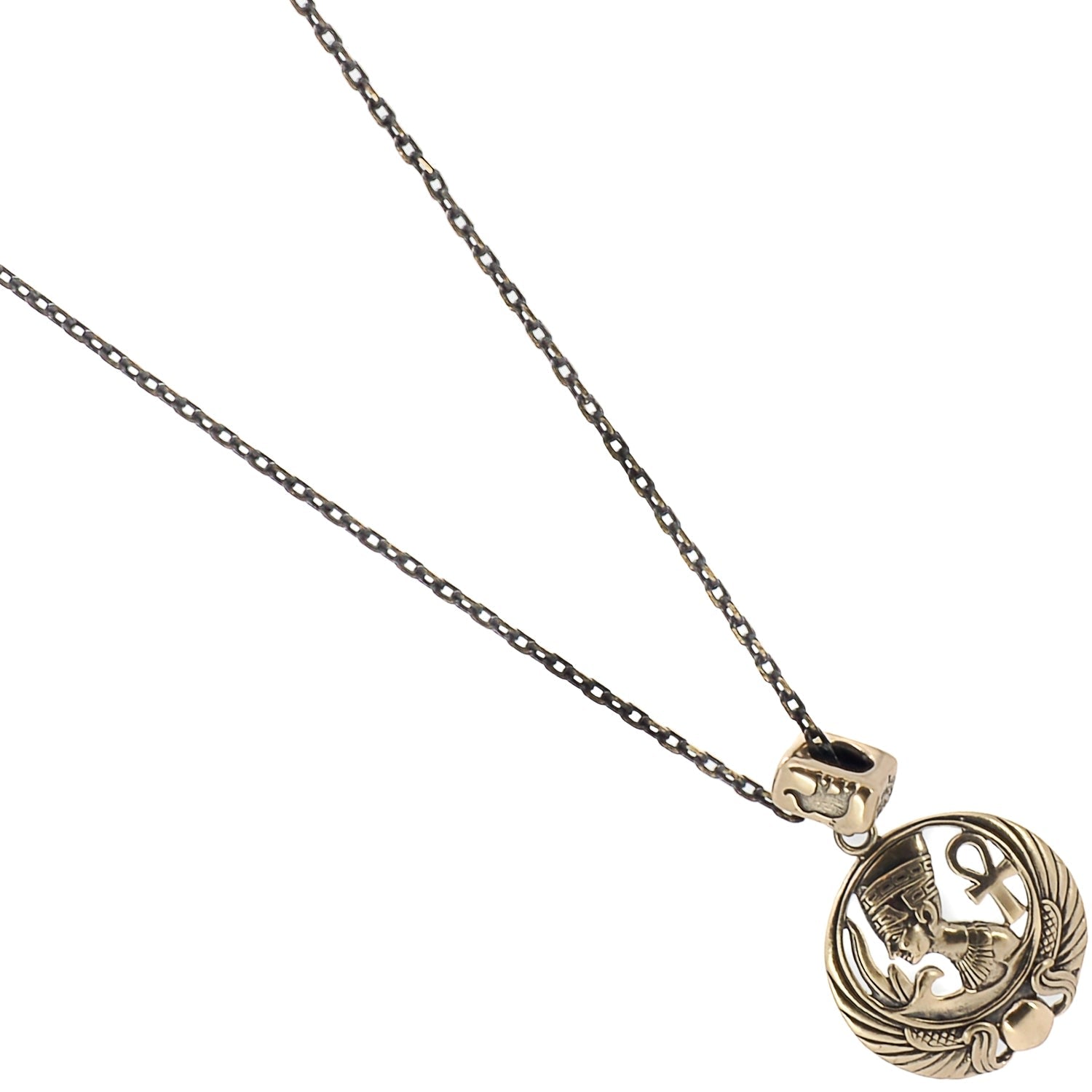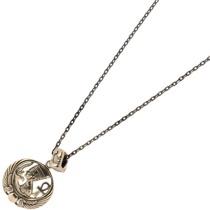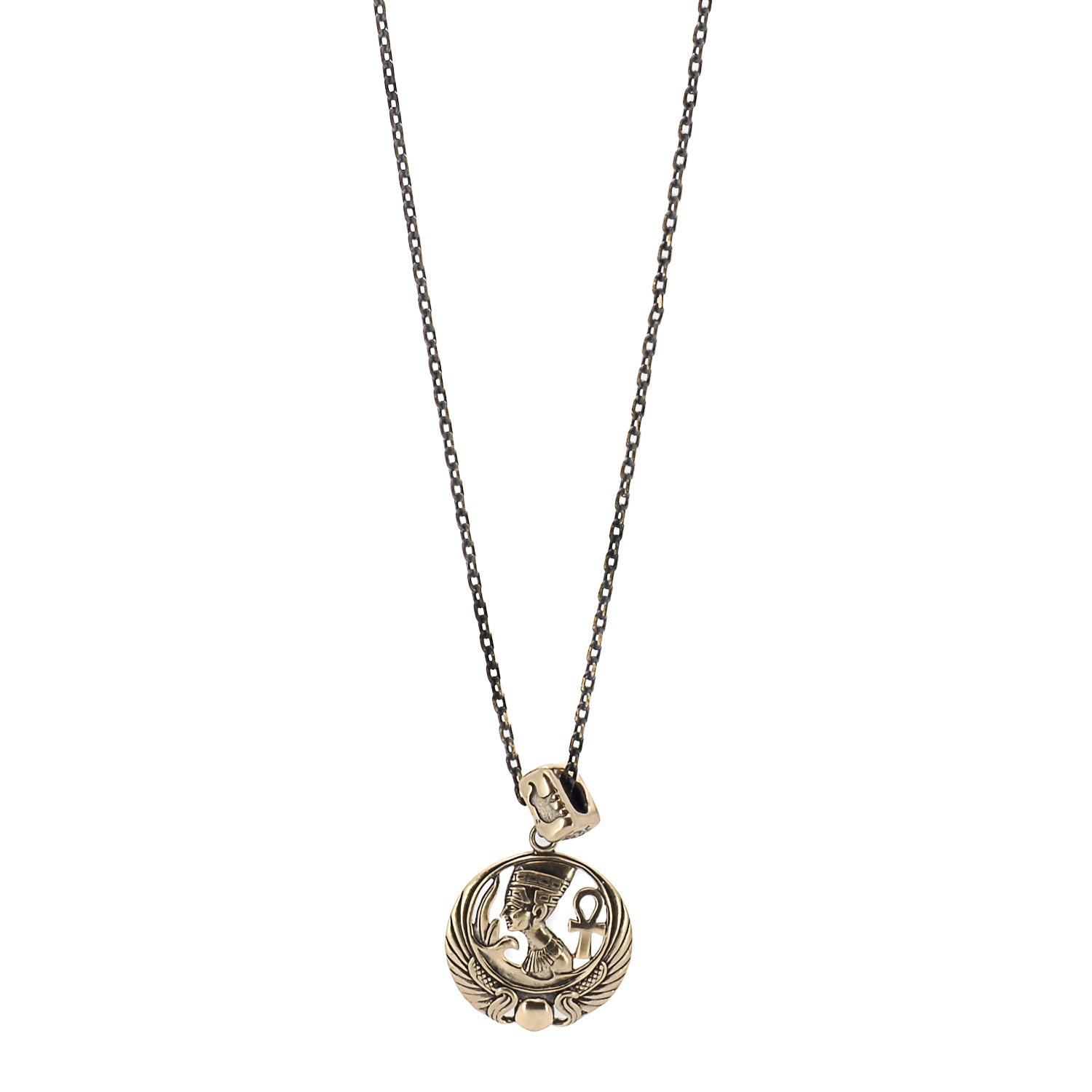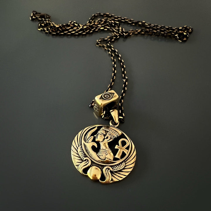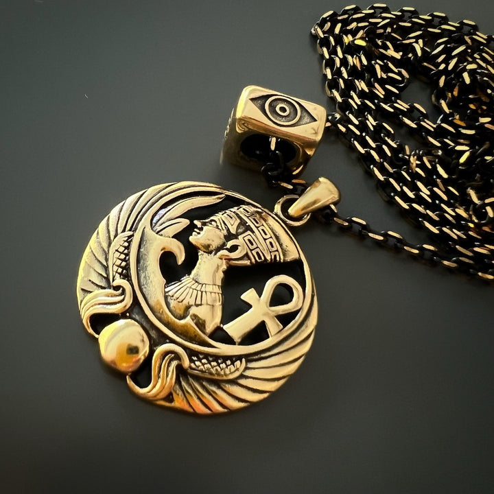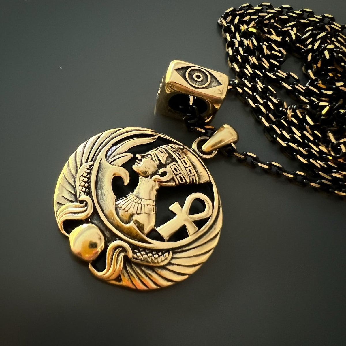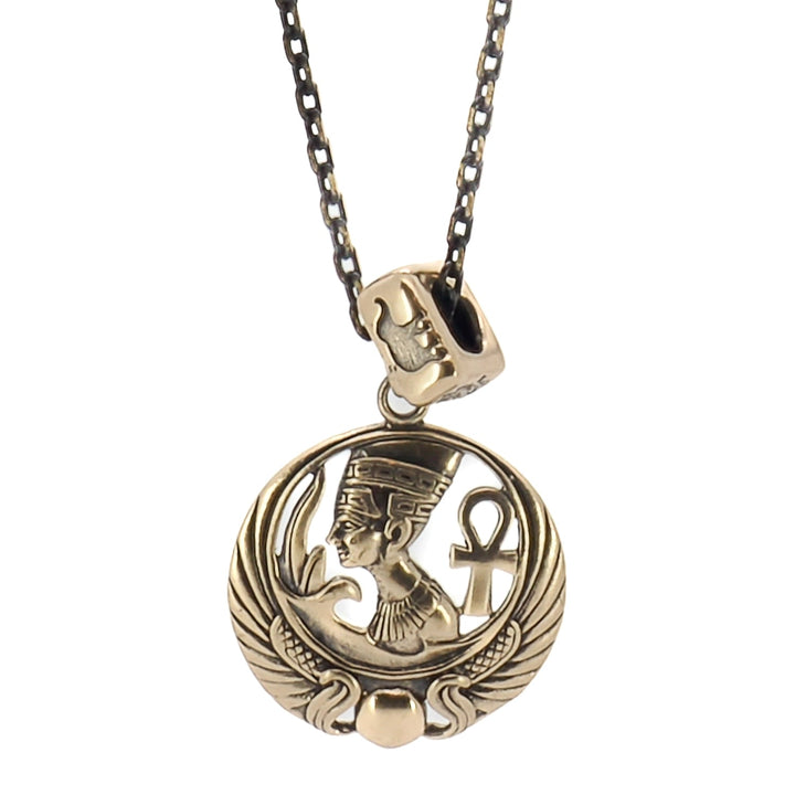 This necklace has a long bronze chain. The pendant is made of bronze on a gold-plated surface. The necklace is 36" long, and the pendant is 1.2" in height and width. The pendant features Queen Nefertiti, an Ankh symbol, and symbolic beads.