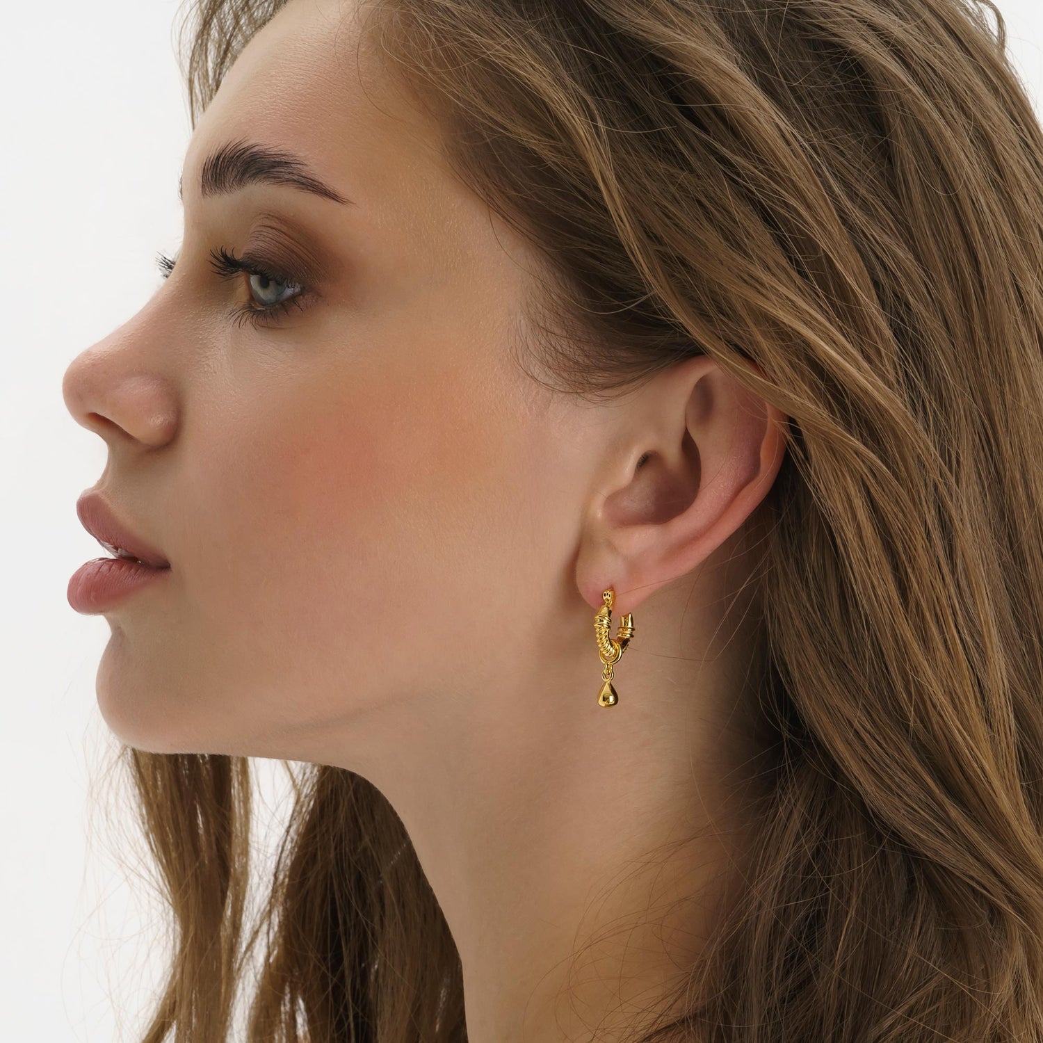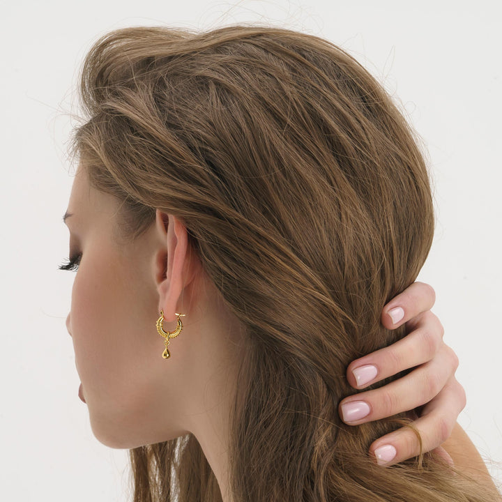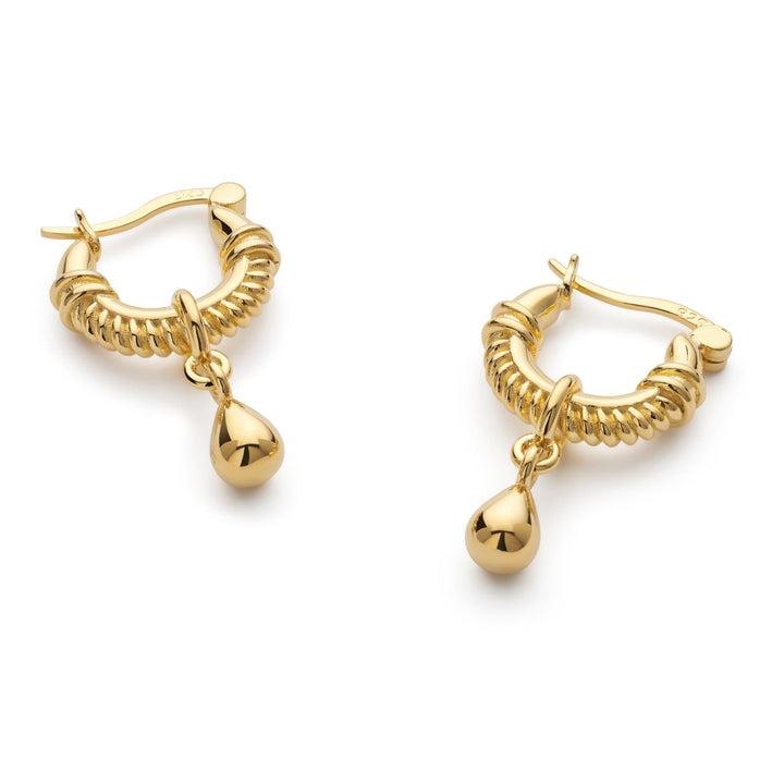 Made with 30 times thicker gold. The perfect addition to any jewellery collection - inspired by ropes and the sea, our teardrop huggie hoops will be your new everydays. Up your effortless elegance in these modern meets vintage hoops. These earrings are made entirely of sterling silver, and then coated in 14k gold plating. Featuring a half twisted rope huggie hoop and a water droplet design. Perfect for gifting!