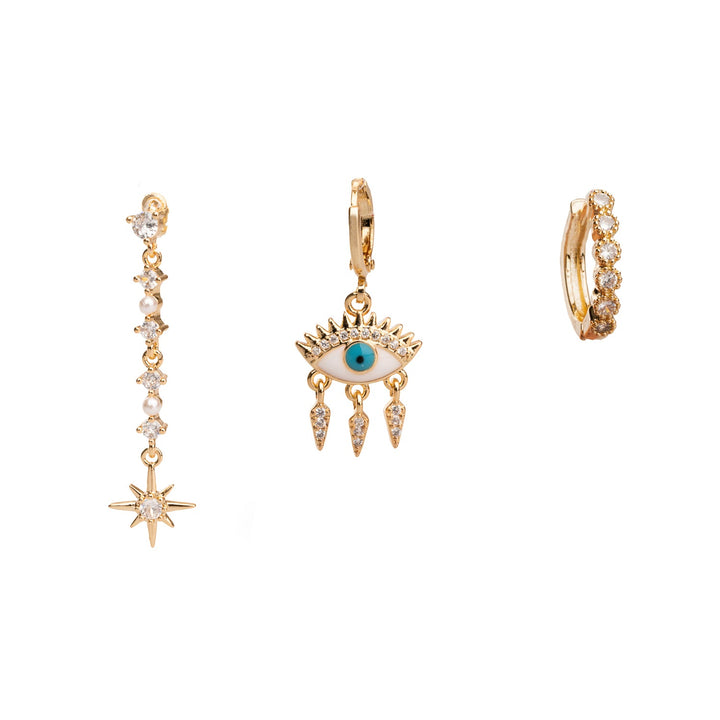 Guidance Star Evil Eye Diamond Hoop Protection Gold Trio Earring Set Gold