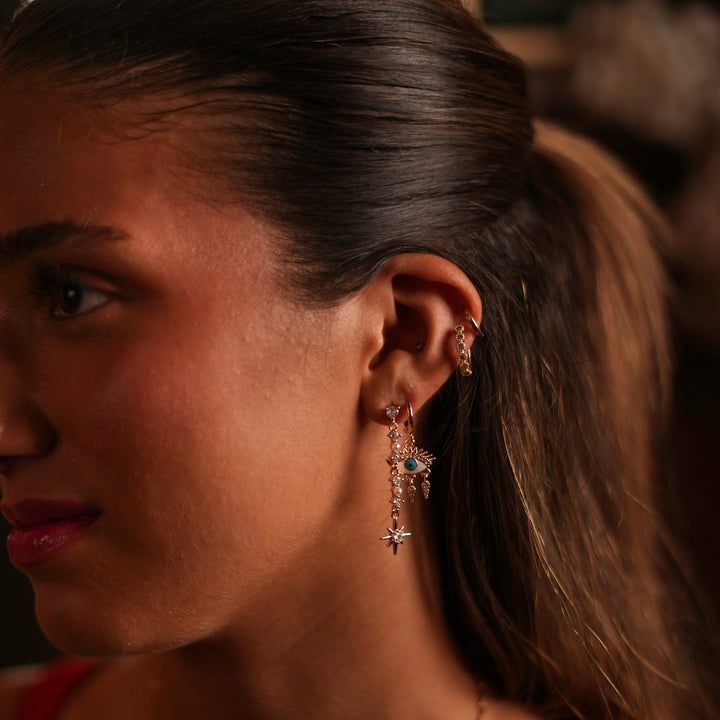 Discover the perfect blend of style and spiritual protection with Guidance Star Evil Eye & Diamond Hoop Protection Gold Trio Earring Set. This set includes three unique earrings: a gold and diamond dangle earring featuring the Guidance Star, a symbolic Evil Eye earring, and a chic gold and diamond hoop earring. Crafted to be lightweight and meaningful, this trio is designed to offer constant protection while seamlessly complementing your style. Perfect for everyday wear, you'll never want to take off this versatile and protective earring set.