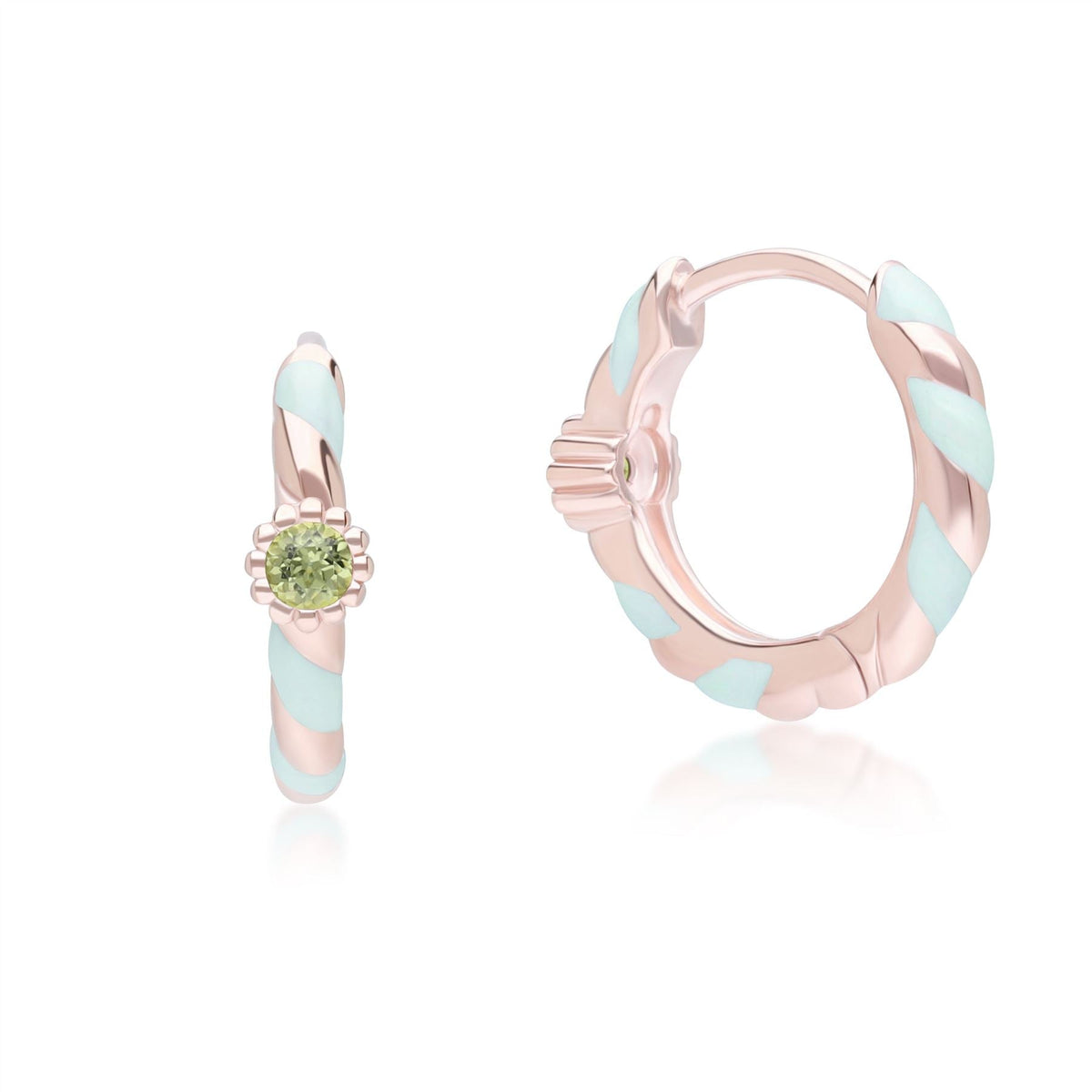The timeless and stunning green enamel in round peridot hoop earrings comes in rose gold plated Sterling silver.