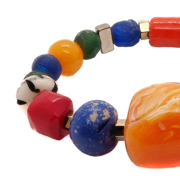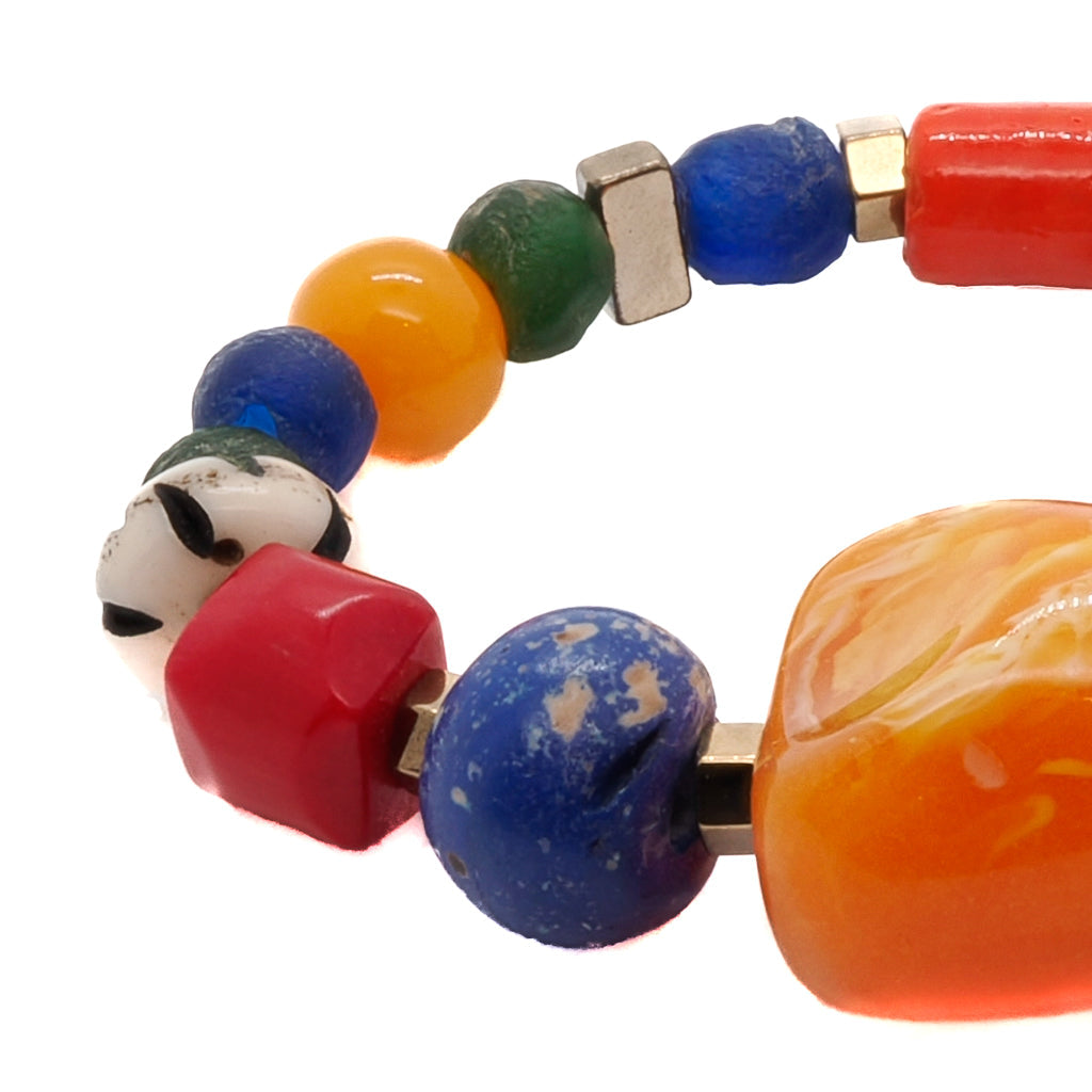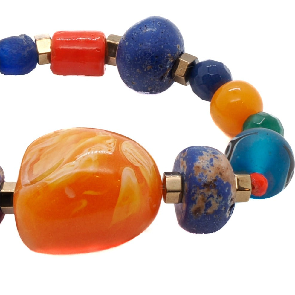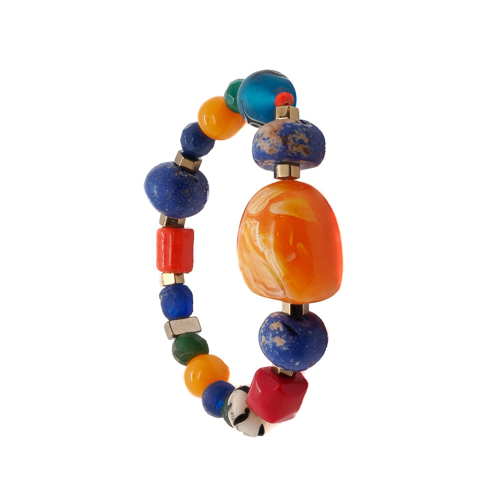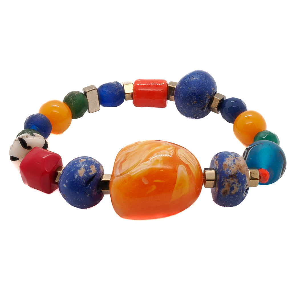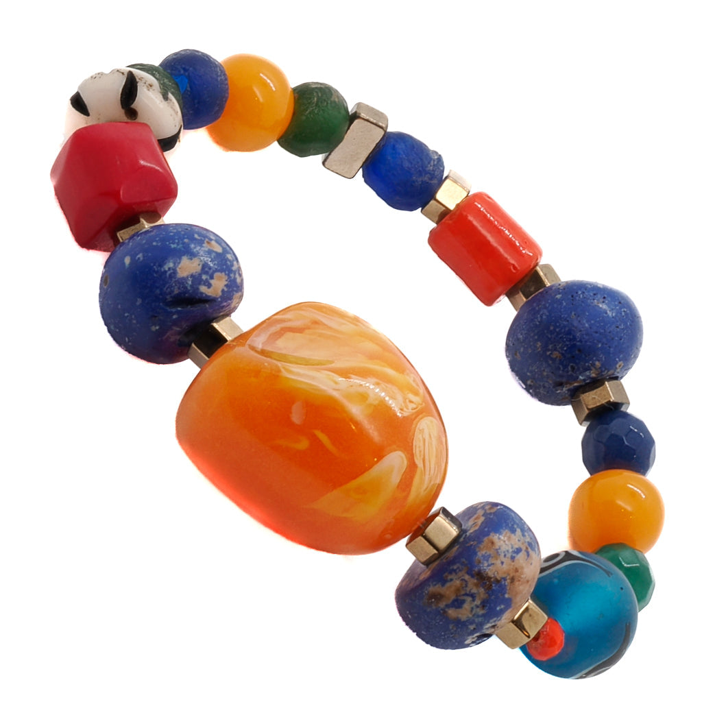 This beaded bracelet features Glass Beads, Nepal blue beads, a Glass blue Evil Eye bead, Gold Hematite Spacers, and Orange Resin Beads. The size is 6.5 inches.
