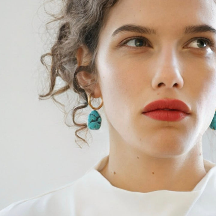 These hoops are made from gold-plated stainless steel and feature turquoise gemstones.