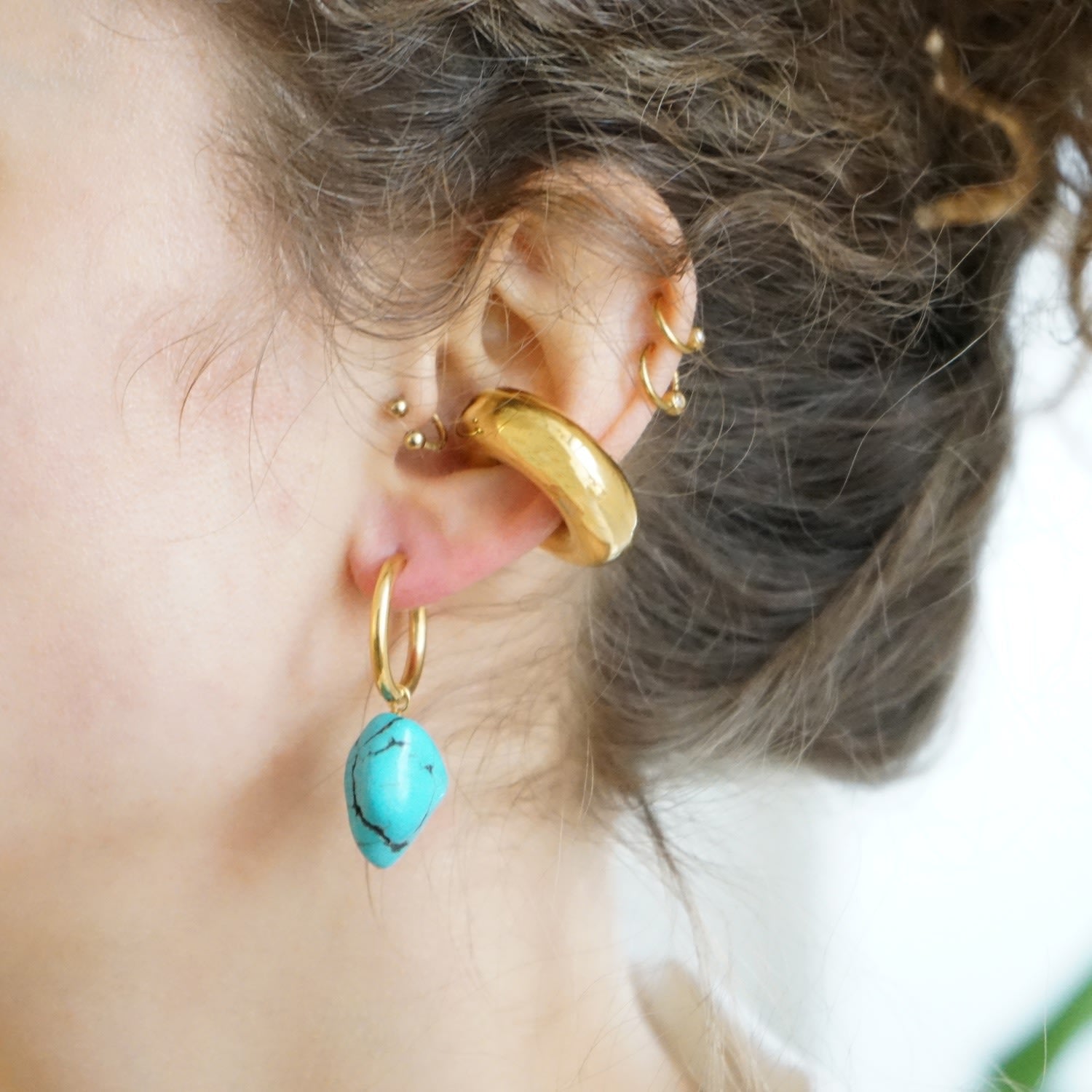 The Turquoise Hoop Earrings Tabitha by Smilla Brav are versatile hoops crafted from gold-plated stainless steel with detachable turquoise gemstones. Known for its balancing properties, turquoise is said to bring inner calm. These handmade earrings can be worn with or without the stones.