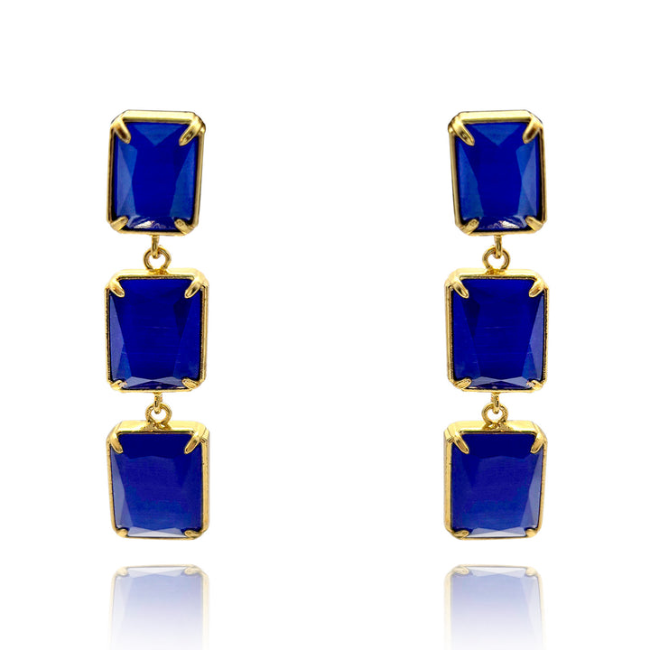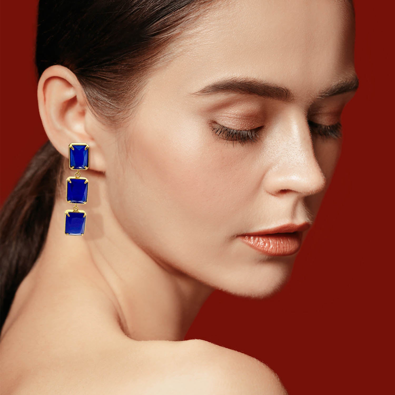 Indulge in the allure of our Sapphire Blue Triple Drop Octagon Cat's Eye Earrings, a must-have for lovers of all shades of blue. Crafted in gold-plated brass, these earrings exude sophistication and versatility, making them a timeless addition to any jewelry collection. Each earring features triple drop octagon cat's eye stones in a stunning sapphire blue hue. The rich color and unique octagonal shape add a touch of elegance and intrigue to the design. The gold-plated brass setting complements the vibrant blue stones, enhancing their beauty and brilliance.