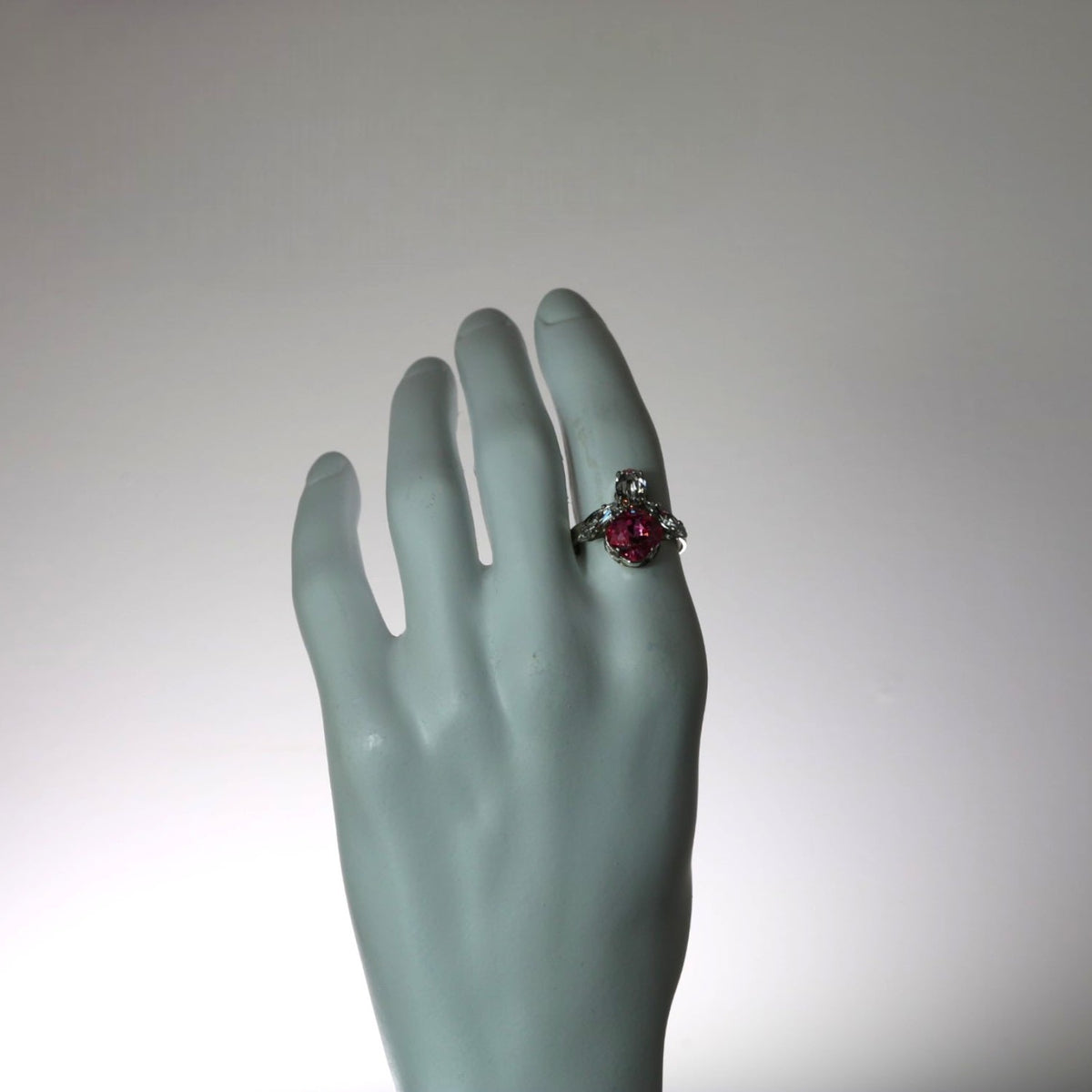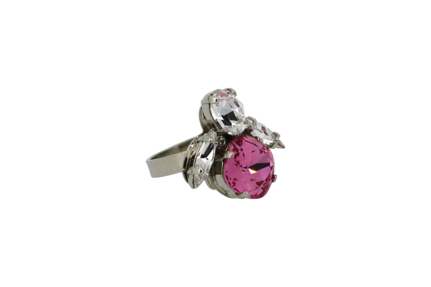 This The Pink Bee Ring In Platinum by Vickisarge is an iconic and dazzling staple that is quintessentially VICKISARGE. Handcrafted in their Kensington workshop, the ring features a stunning cushion-cut crystal that captures and reflects light with a demure and luxurious brilliance. The design is perfect for both day and night, adding a touch of sophisticated glamour to any outfit. This piece embodies the brand's unique blend of boldness and elegance, making it a must-have accessory that is both dazzling and effortlessly chic.