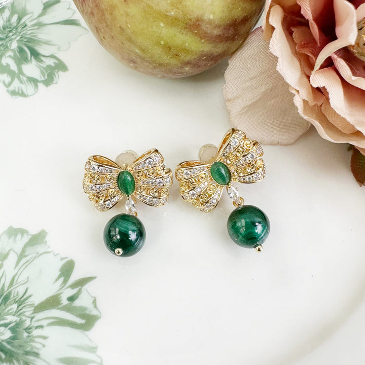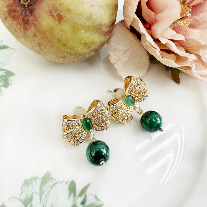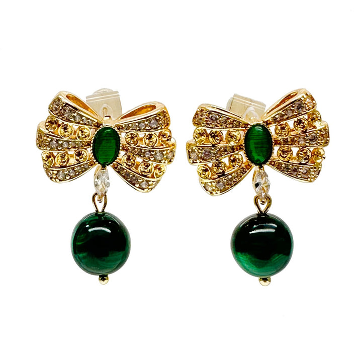 These earrings feature malachite stones and a butterfly bow design. They have a dangle style.