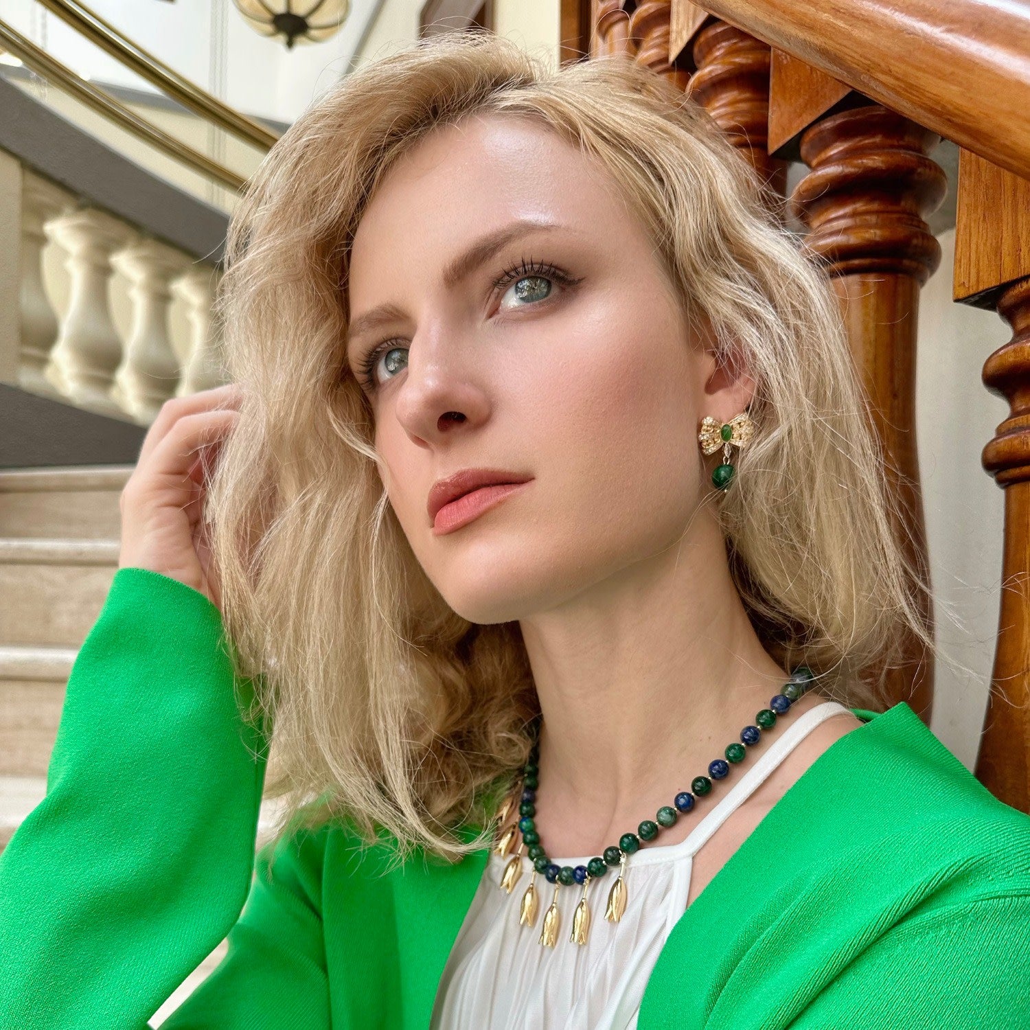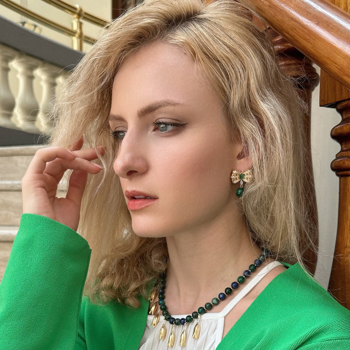 These Butterfly Bow With Malachite Dangle Earrings by Farra are cute and feminine. The malachite bow design creates a delicate and charming look, perfect for any occasion. They pair perfectly with a simple hairstyle, offering a stunning effect when your hair is tied up. These earrings are a beautiful and elegant accessory.