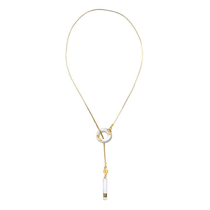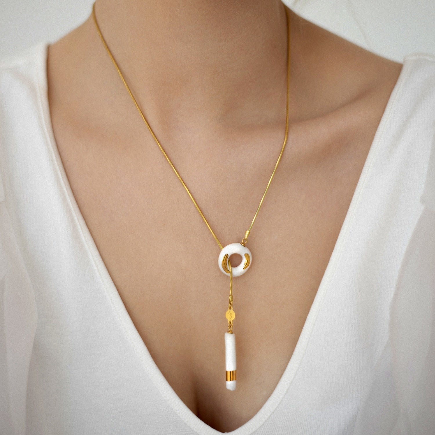 This necklace features a hand-made porcelain pendant and a 24k gold-over-925 sterling silver chain and details.