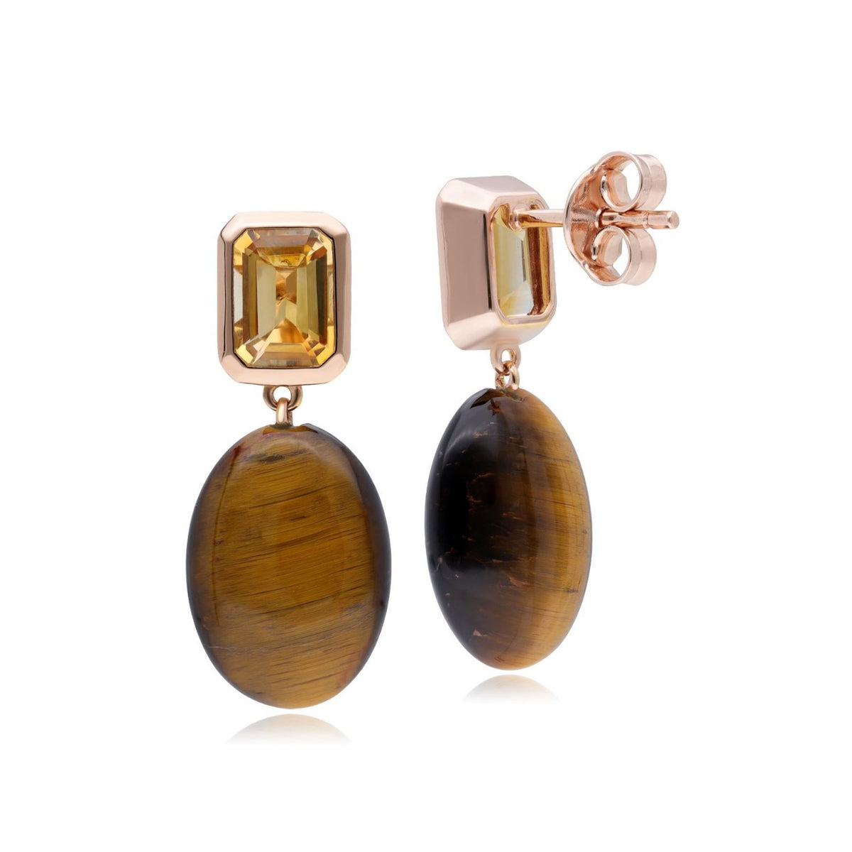 A glamorous pair of dangle drop earrings complete with vibrant citrine and mysterious tigers eye drop earrings in rose gold plated sterling silver. These earrings come with a post & butterfly back.