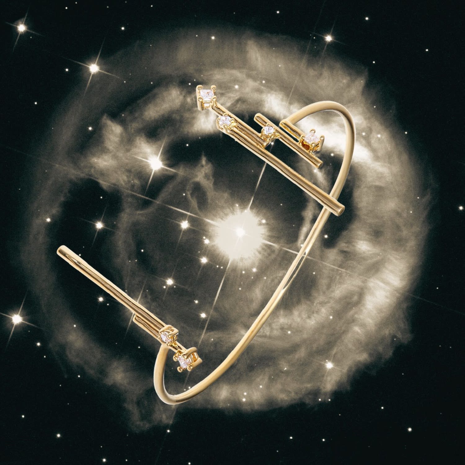 The Gold & Crystal Statement Bangle by Grossé is a luxurious and elegant accessory. This open-designed bangle is inspired by the light emitted by stars, featuring six shimmering Czech crystals. The bangle is fully 23 carat gold plated, giving it a graceful and minimalistic look. Its slightly bendable design makes it easy to put on and take off, and the crystals add a touch of glamour and shine to any outfit.