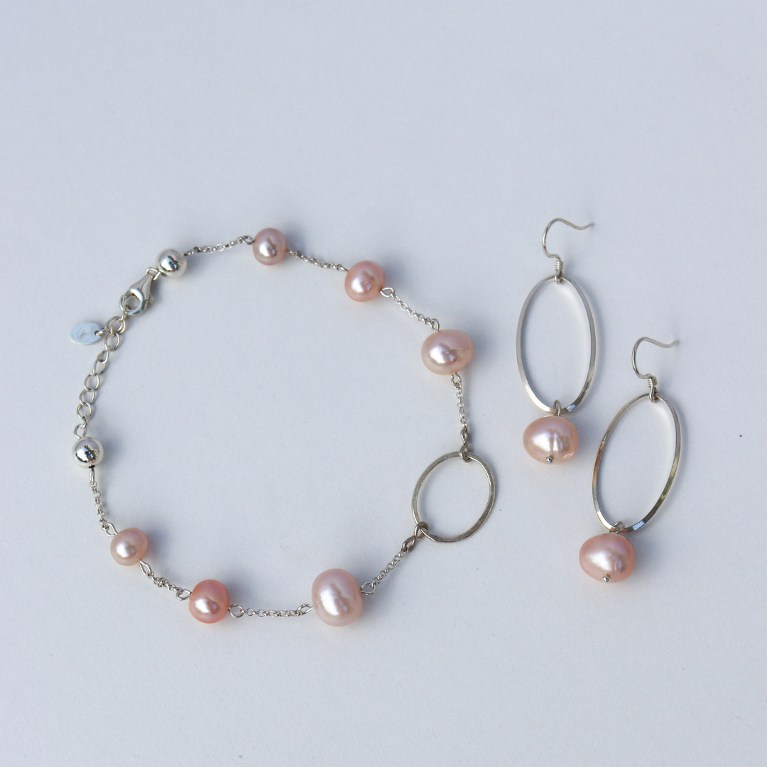 Hanging on a sterling silver hook style earring and sterling silver oval is a perfect pink freshwater pearl. These earrings were designed to be modern, while the addition of the pink freshwater pearl ensures these earrings are simply timeless.