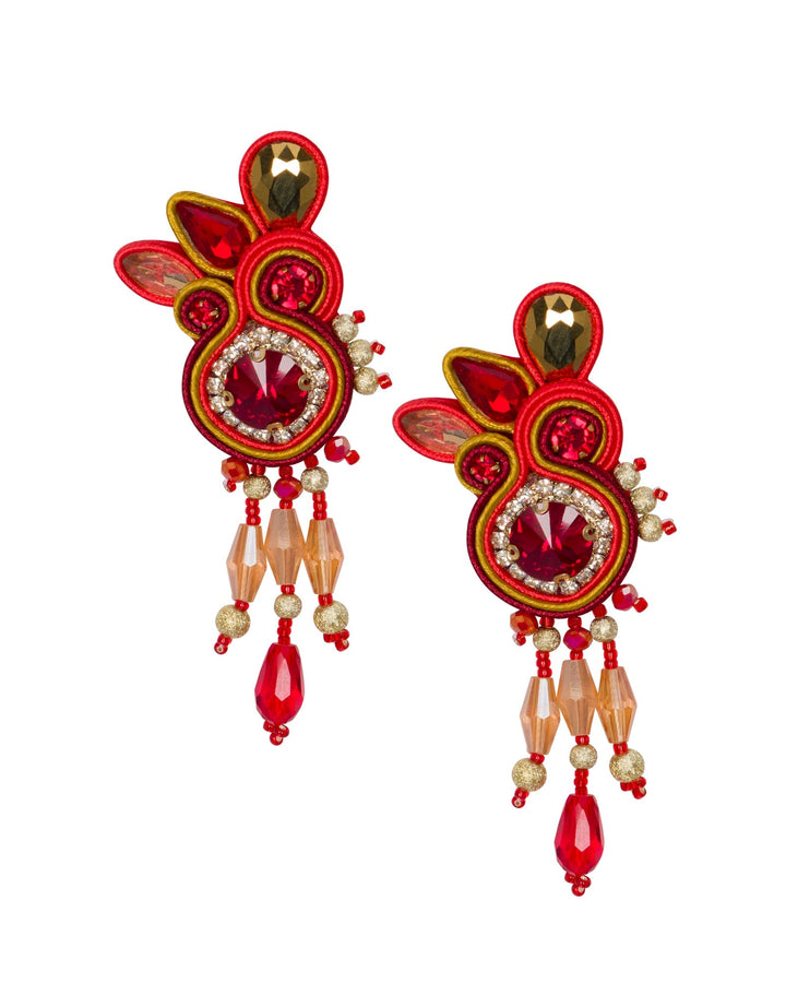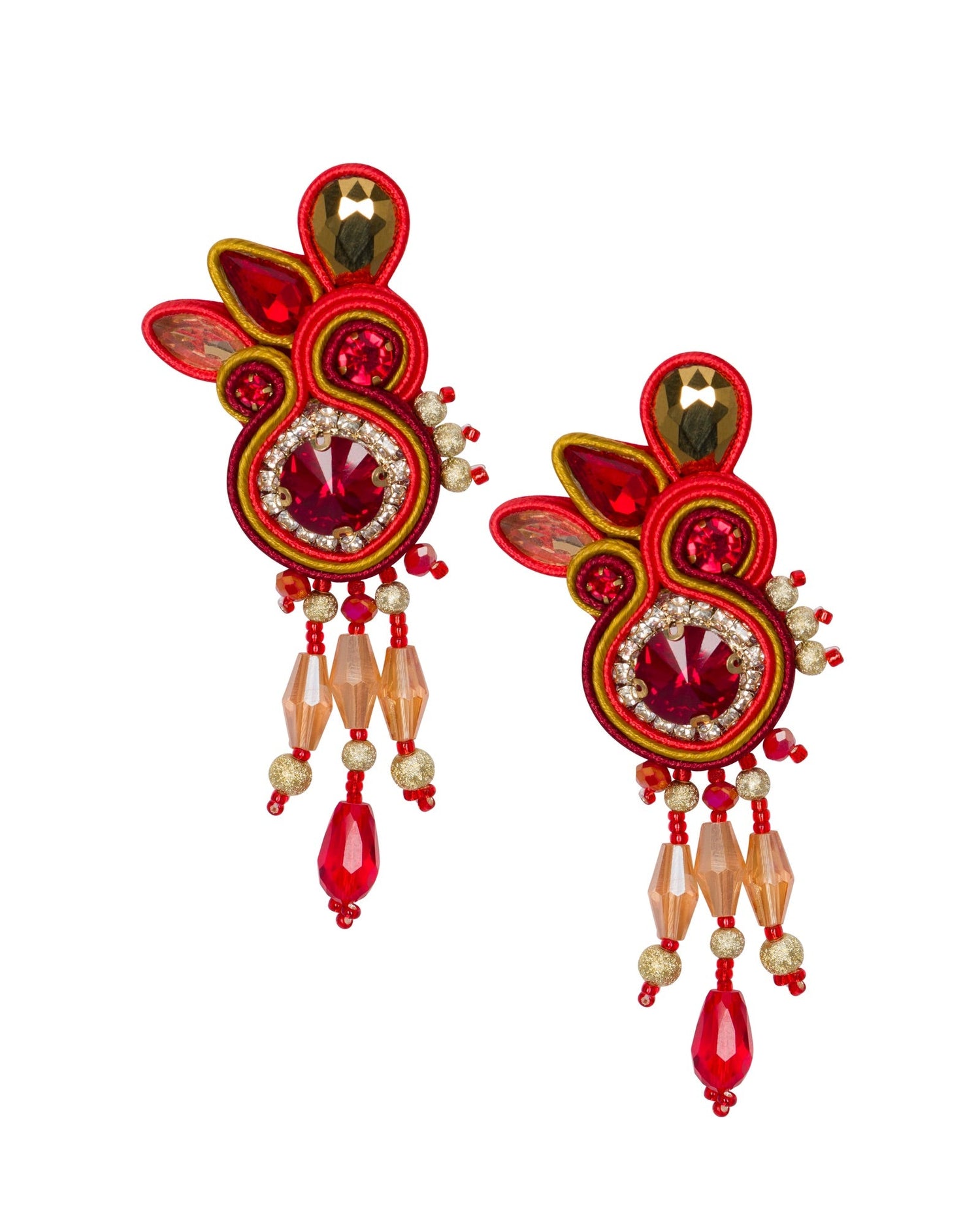 Feel like royalty everywhere you go with these fabulous rhinestone earrings! Constructed of red soutache trim with seed beads and covered in eye-catching rhinestones, these sparkly earrings are perfect for adding some flair to any outfit. Set on a felt post backing, these earrings are as comfortable as they are fabulous. As if these earrings aren't over-the-top enough, the beaded fringe is guaranteed to dazzle as it dangles down either side of your jawline. These earrings look best with your hair pulled back at the center of attention! Material: Plastic Beads, Rhinestones, Soutache Trim, Felt Clasp: Post Back