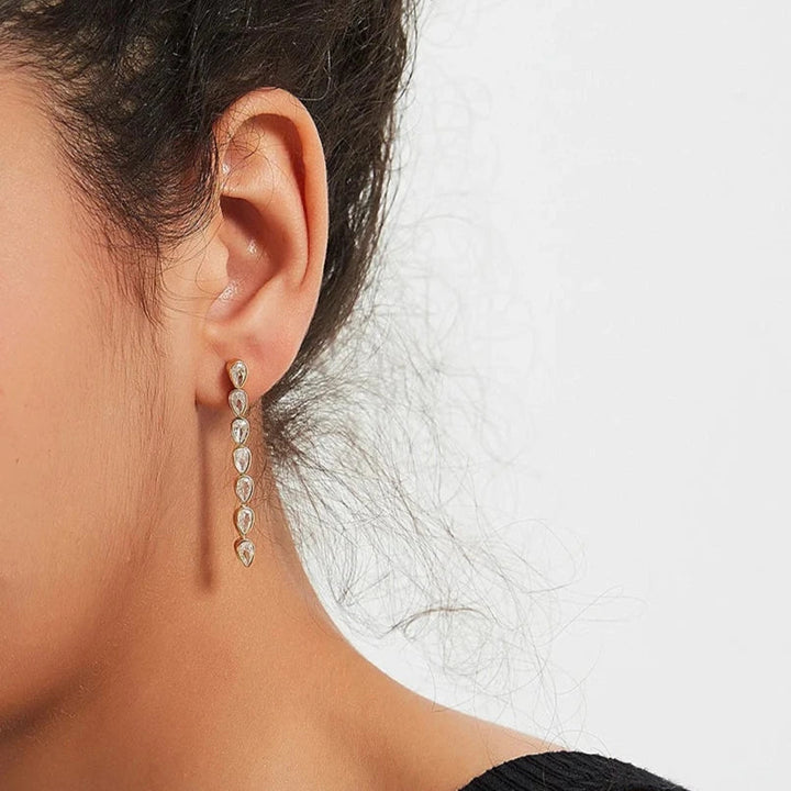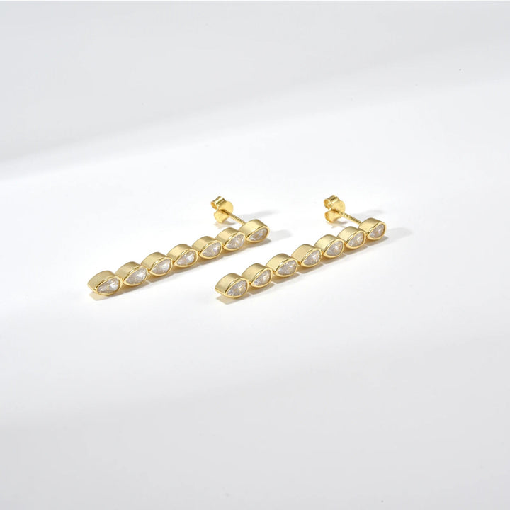 These earrings are made with a 100% recycled Sterling Silver base with a thick layer of high-quality 14k gold plating. They feature a pear-shaped duster design and are waterproof, tarnish-free, sweatproof, and hypoallergenic. They are engraved with a cubic zirconia stone.