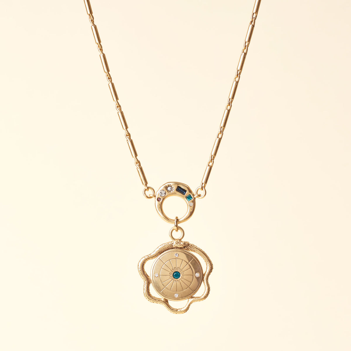 This Montgomery Charm Necklace by Mignonne Gavigan is a beautiful accessory that blends classic elegance with a sense of timeless adventure. Suspended from a delicate yet bold chain, the necklace features a beautifully crafted compass-inspired pendant, which is framed by a softly scalloped serpent. Ideal for layering or making a statement on its own, this piece is perfect for those who seek beauty with a purpose and a reminder to find your direction.