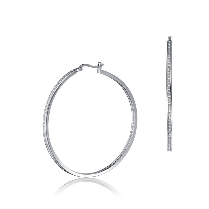 Stylish .925 Sterling silver cubic zirconia halo hoop earrings. These earrings feature small clear round cubic zirconia stones set in bar. Crafted of .925 Sterling silver in rhodium plating and secure with saddleback closure.