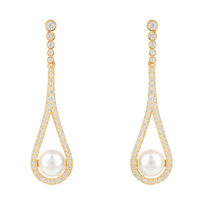 Formed of a long drop which cradles a freshwater pearl these sleek and contemporary pearl designer earrings are adorned with zirconia accents. The vast amount of zirconia makes these earrings hypnotic with their dazzling effect as they catch the light from day to night. The purity of these earrings make them an idea finishing touch for any evening, bridal or wedding attire. Pearls are a forever classic. They're the epitome of traditional style, an accessory that will never let you down. This timeless gemstone will take you to every significant event of your life. These earrings make an impact but are comfortable to wear. Pierced earrings with post back and butterfly fastening.