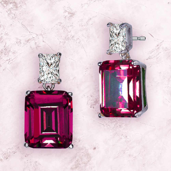 Stylish .925 Sterling silver emerald cubic zirconia rectangle stud earrings. These feature clear radiant cubic zirconia stone on the top and a drop of a vibrant large emerald green emerald cut cubic zirconia stone. crafted in .925 Sterling silver with White Gold plating and secure with butterfly closure. These earrings are also available in colors Ruby, Sapphire, Emerald, Pink and Yellow.