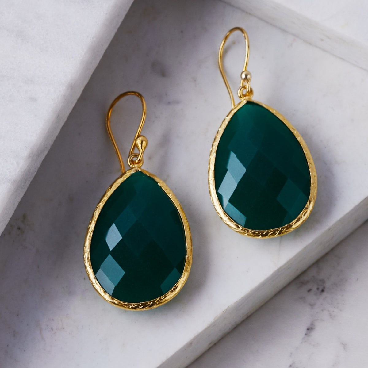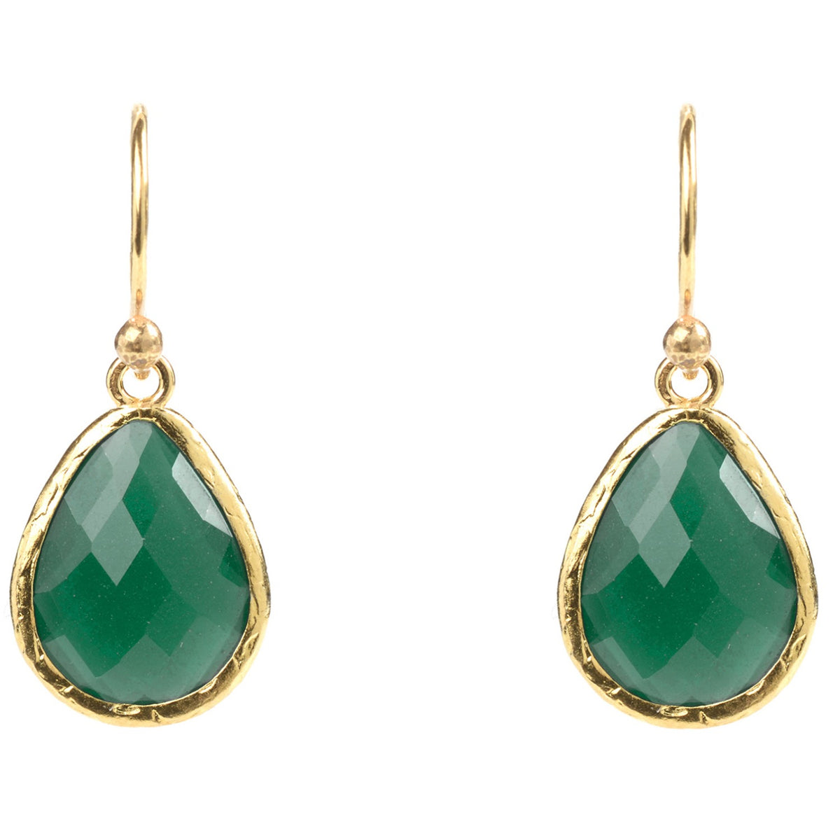 18ct gold plated sterling silver drop earring with french hook. This stunning petite drop earring features multi-faceted green onyx crystals.