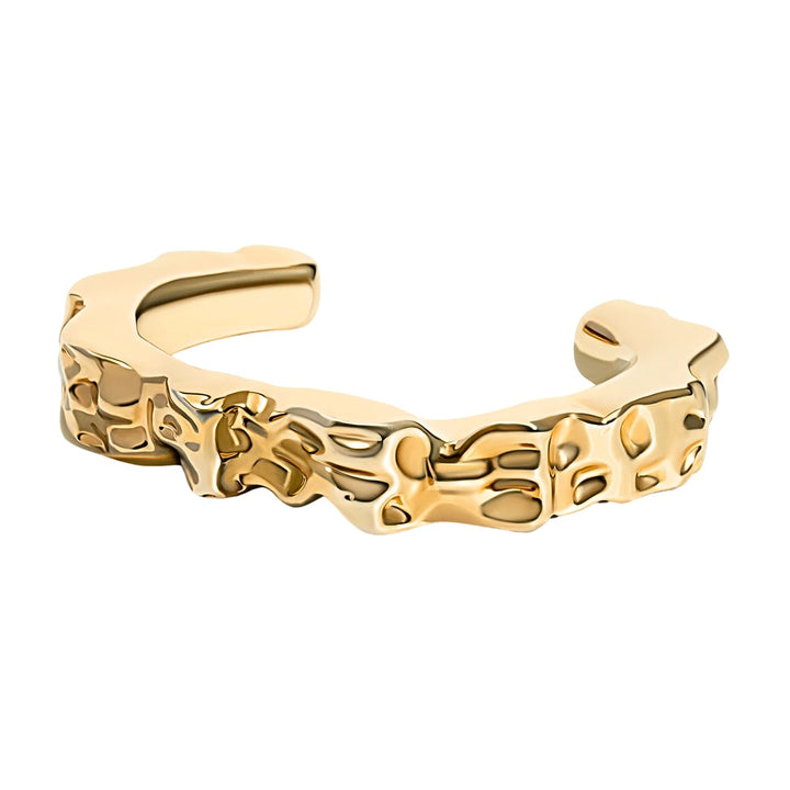 This cuff bracelet is made from hypoallergenic materials with an 18k gold-filled, hammered rock mimic design.