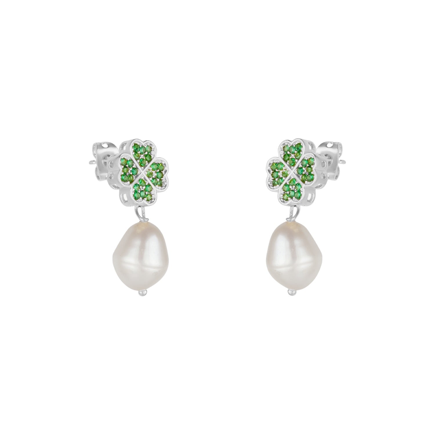 Experience the luck and beauty of our Four Leaves Clover Stud Pearl Drop Earrings. Handmade by skilled craftsmen, these earrings feature small green gemstones and a lustrous pearl. Embrace elegance and charm with these gold earrings. Every pearl is naturally unique in its irregularity; imperfections are here to be celebrated.