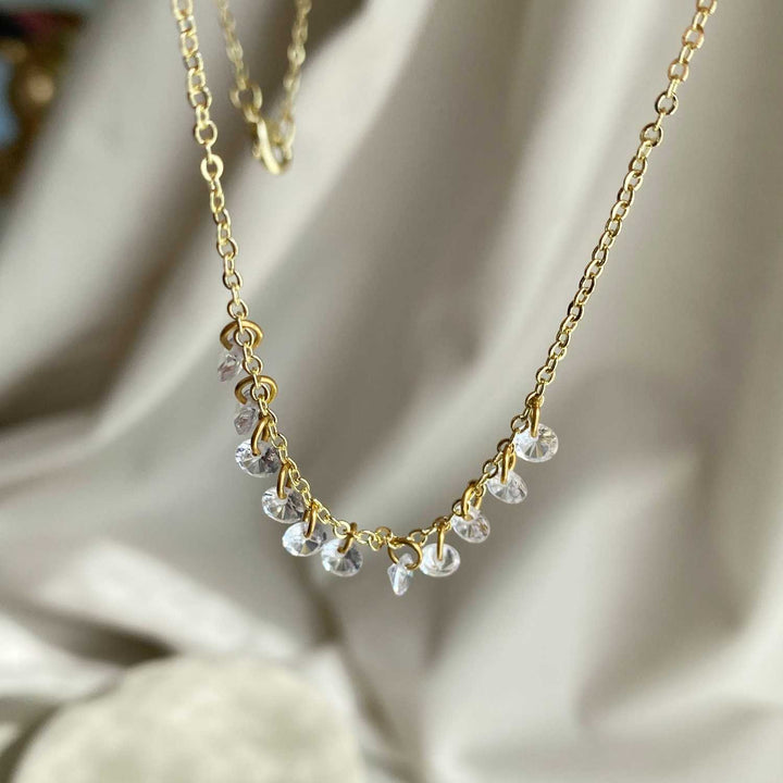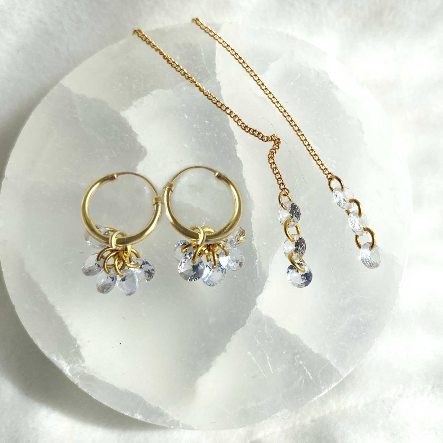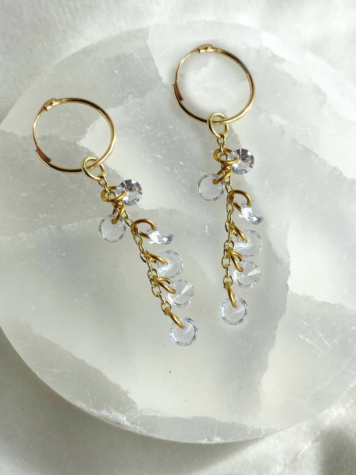 With its barely there presence and sophisticated minimalism, these Rising Star Naked diamond long drops are a modern alternative to boring hoops The 6 shimmering round diamonds hang from each loops on the gold chain creating earrings that are as light as a feather and sparkles all the way. Alone as an everyday piece or layered with your other favourites for a gorgeous earscape, it is most certainly a contemporary classic.